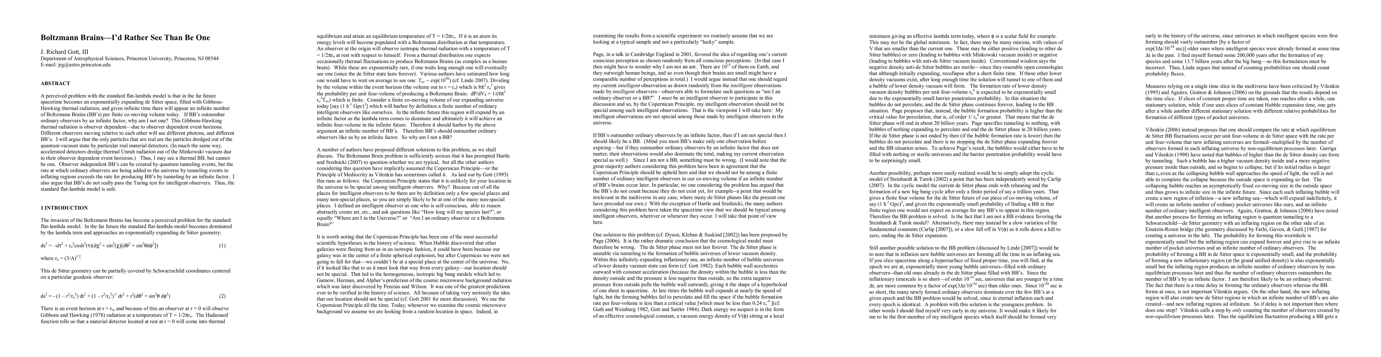 A perceived problem with the standard flat-lambda model is that in the far future spacetime becomes an exponentially expanding de Sitter space, filled with Gibbons-Hawking thermal radiation, and given infinite time there will appear an infinite number of Boltzmann Brains (BB's) per finite co-moving volume today. If BB's outnumber ordinary observers by an infinite factor, why am I not one? This Gibbons-Hawking thermal radiation is observer dependent--due to observer dependent event horizons. Different observers moving relative to each other will see different photons, and different BB's. I will argue that the only particles that are real are the particles dredged out of the quantum vacuum state by particular real material detectors. (In much the same way, accelerated detectors dredge thermal Unruh radiation out of the Minkowski vacuum due to their observer dependent event horizons.) Thus, I may see a thermal BB, but cannot be one. Observer independent BB's can be created by quantum tunneling events, but the rate at which ordinary observers are being added to the universe by tunneling events to inflating regions exceeds the rate for producing BB's by tunneling by an infinite factor. I also argue that BB's do not really pass the Turing test for intelligent observers. Thus, the standard flat-lambda model is safe.
