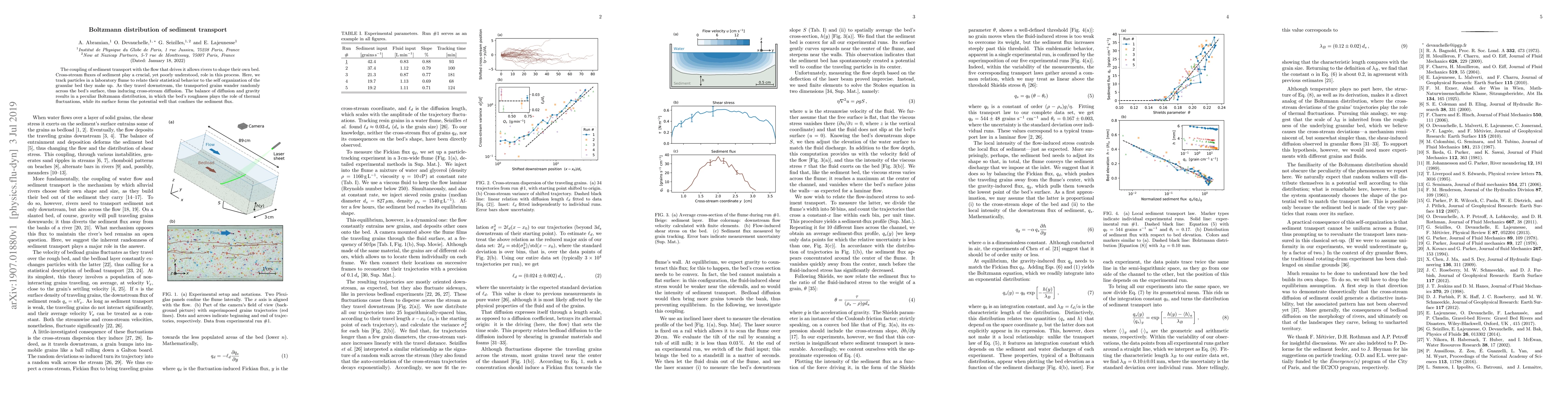 This study investigates the statistical behavior of sediment particles in river flow, revealing that sediment transport induces cross-stream diffusion, leading to a Boltzmann distribution. The bed's roughness acts like thermal fluctuations, while its surface forms a potential well that confines sediment flux.