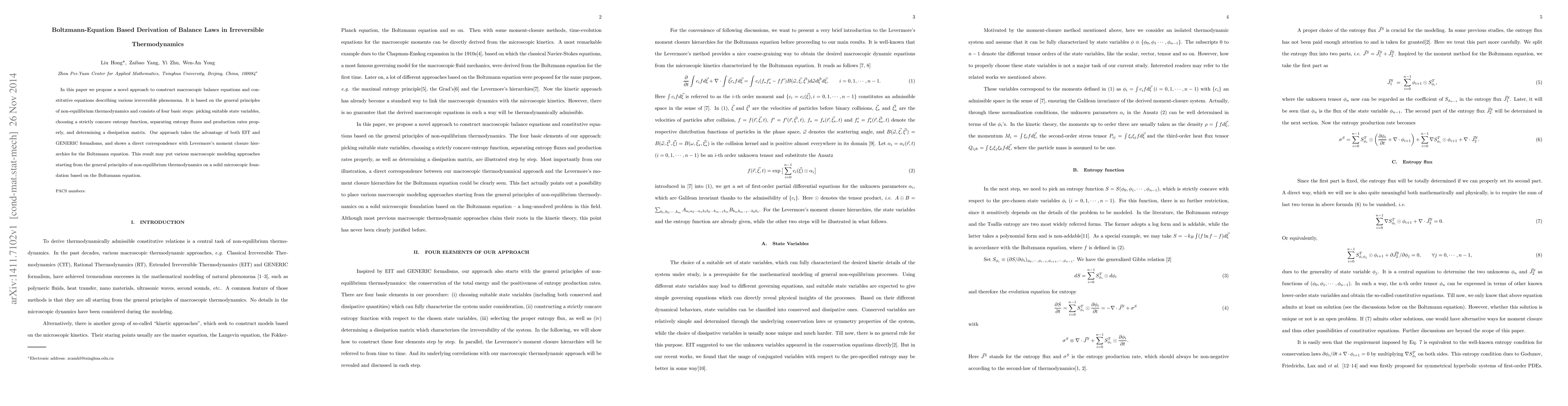 This paper develops a new method to derive macroscopic balance laws in irreversible thermodynamics using Boltzmann-equation principles, combining EIT and GENERIC formalisms, and aligning with Levermore's moment closure hierarchies. The method involves selecting state variables, entropy functions, and dissipation matrices to provide a microscopic foundation for macroscopic modeling.