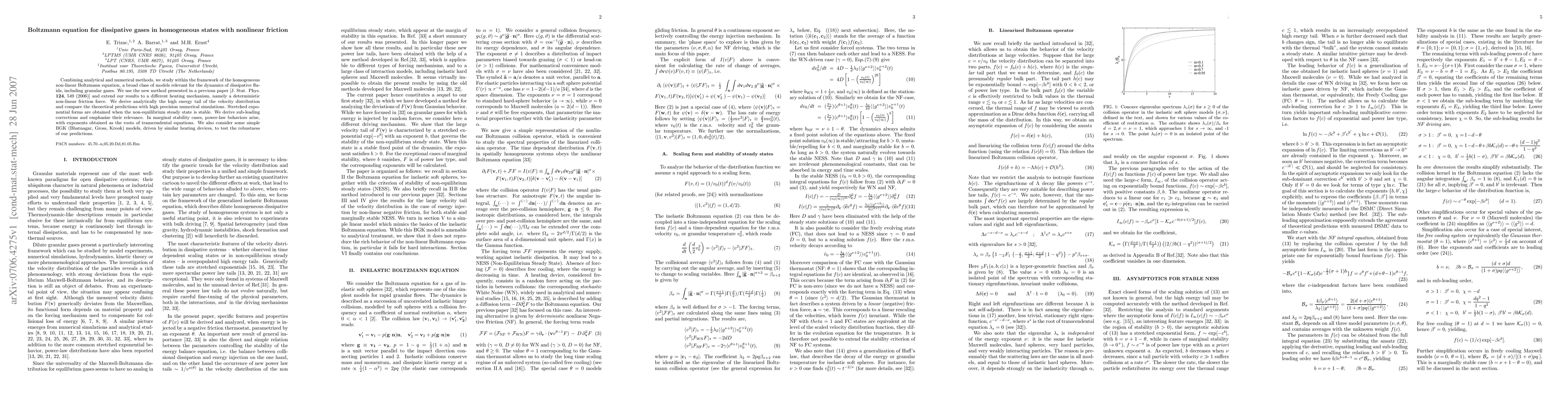 This paper combines analytical and numerical methods to study dissipative gases using the homogeneous non-linear Boltzmann equation, focusing on the dynamics of granular gases under deterministic nonlinear friction. It derives the high-energy tail of the velocity distribution and compares theoretical predictions with numerical simulations, revealing stretched exponential forms in stable steady states and power-law behaviors in marginal stability cases.