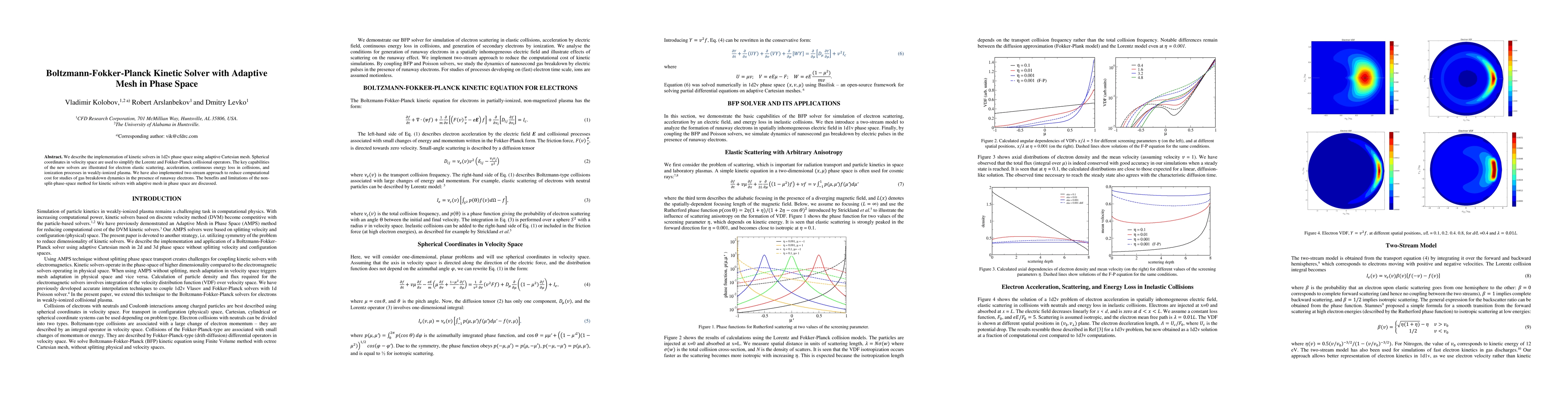 This paper presents a kinetic solver for 1d2v phase space using adaptive Cartesian mesh, simplifying Lorentz and Fokker-Planck collisional operators in spherical velocity coordinates. The solver is demonstrated for electron scattering, acceleration, and ionization in weakly-ionized plasma, and includes a two-stream approach to lower computational costs for gas breakdown studies.
