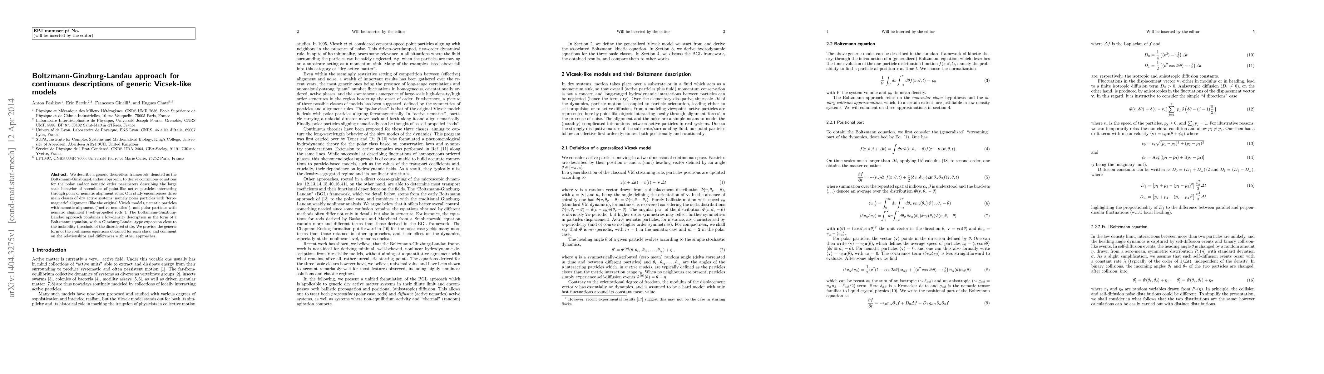 This paper introduces a Boltzmann-Ginzburg-Landau approach to derive continuous equations for order parameters in Vicsek-like models, encompassing polar and nematic alignments in active particle systems. The framework combines low-density Boltzmann equations with Ginzburg-Landau expansions near instability thresholds.