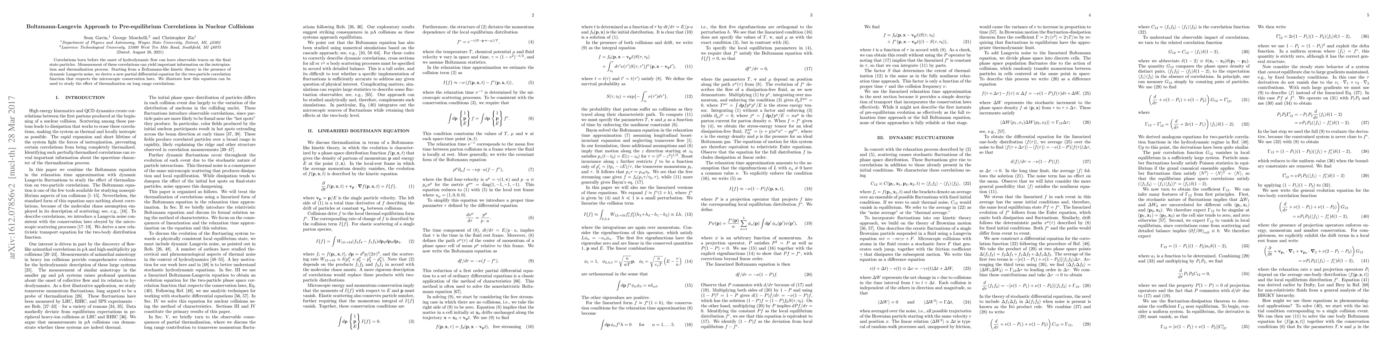 This paper develops a Boltzmann-Langevin approach to study pre-equilibrium correlations in nuclear collisions, deriving a new partial differential equation for the two-particle correlation function that respects conservation laws, and uses it to investigate the impact of thermalization on long-range correlations.
