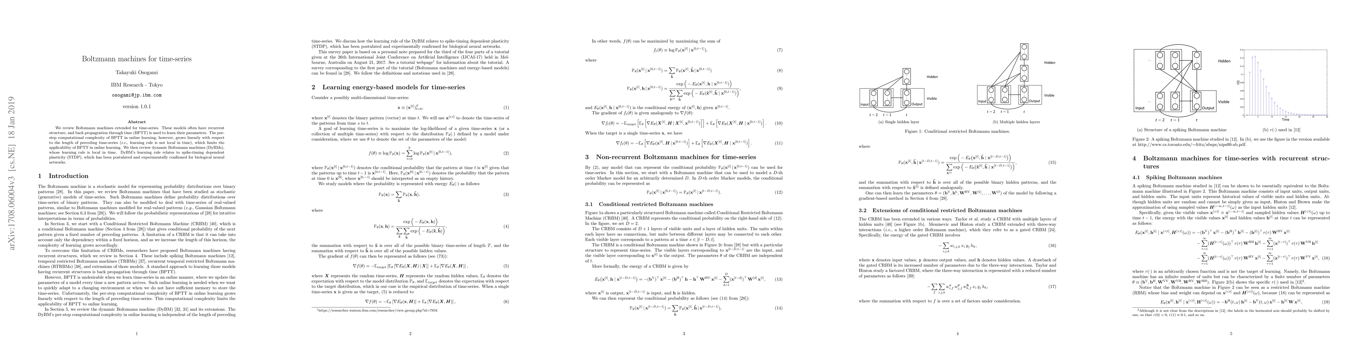 This paper reviews Boltzmann machines adapted for time-series, highlighting the limitations of backpropagation through time (BPTT) in online learning due to its non-local learning rule. It introduces dynamic Boltzmann machines (DyBMs) with a local learning rule inspired by spike-timing dependent plasticity (STDP), offering a more feasible approach for online learning.