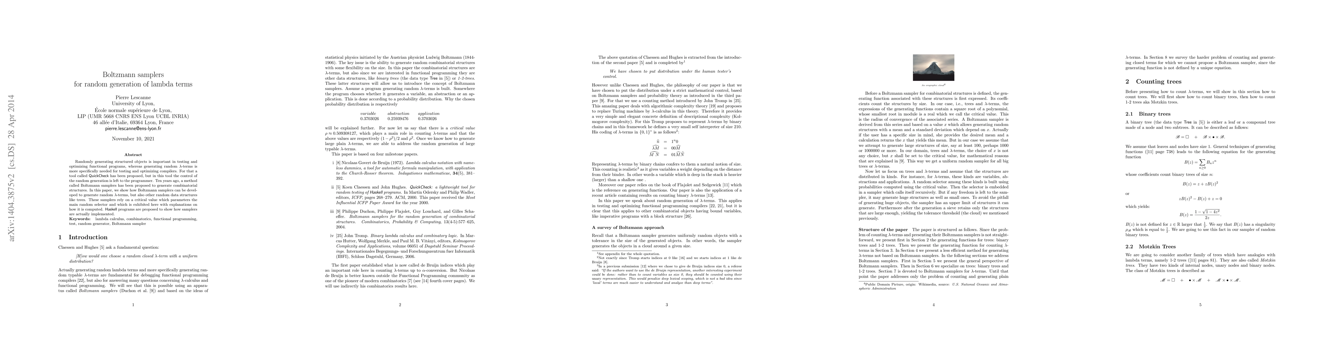 This paper introduces Boltzmann samplers for generating lambda terms and other data structures, providing a method to control the random generation process. It explains the critical value parameter and demonstrates implementation in Haskell.