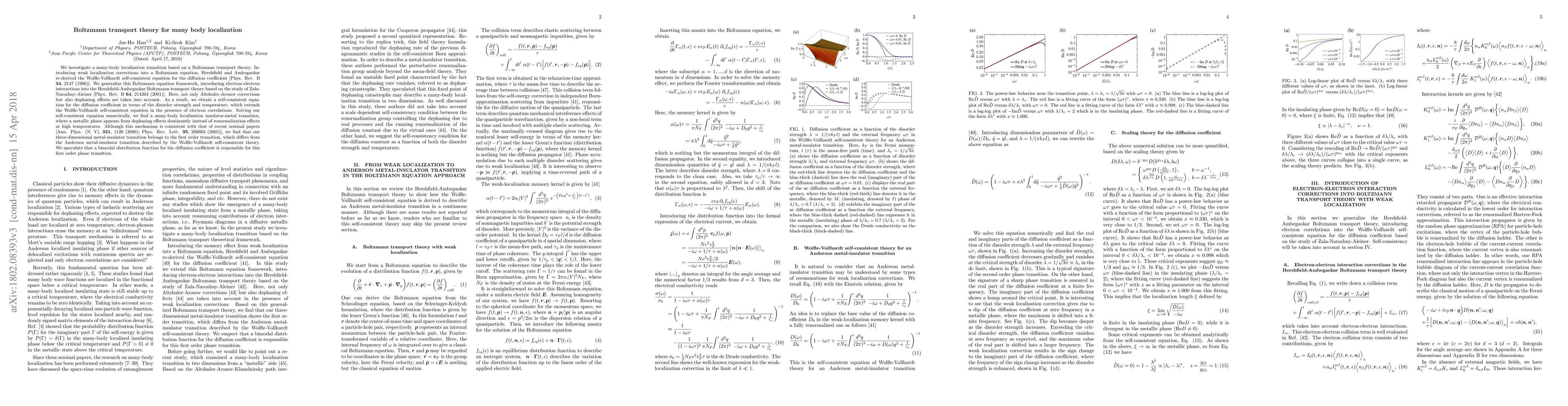 This paper extends the Boltzmann transport theory to study many-body localization, incorporating electron-electron interactions and dephasing effects. It finds a first-order many-body localization transition in three dimensions, differing from the Anderson transition, potentially due to a bimodal distribution function for the diffusion coefficient.