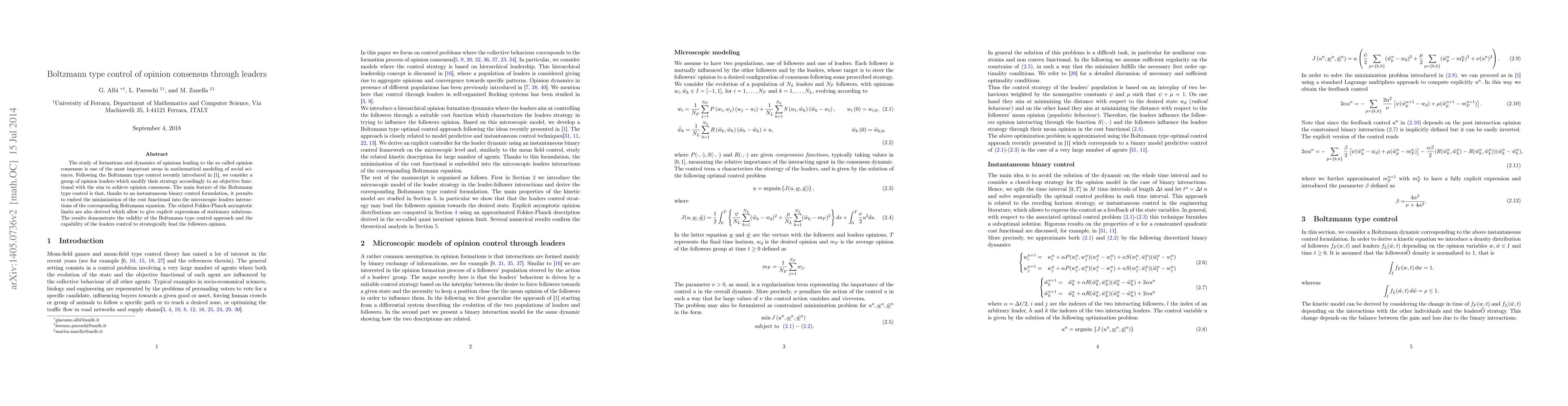 This paper explores the use of Boltzmann type control for achieving opinion consensus among followers through opinion leaders. The approach embeds cost minimization into microscopic leader interactions, leading to explicit expressions for stationary solutions and demonstrating the effectiveness of leader-driven consensus.