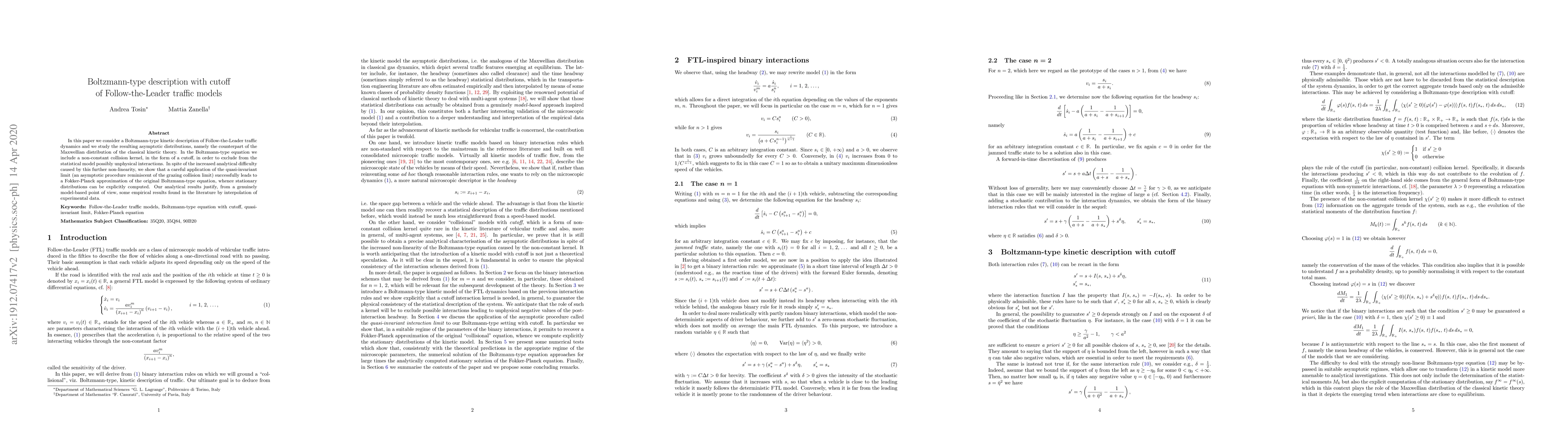In this paper we consider a Boltzmann-type kinetic description of Follow-the-Leader traffic dynamics and we study the resulting asymptotic distributions, namely the counterpart of the Maxwellian distribution of the classical kinetic theory. In the Boltzmann-type equation we include a non-constant collision kernel, in the form of a cutoff, in order to exclude from the statistical model possibly unphysical interactions. In spite of the increased analytical difficulty caused by this further non-linearity, we show that a careful application of the quasi-invariant limit (an asymptotic procedure reminiscent of the grazing collision limit) successfully leads to a Fokker-Planck approximation of the original Boltzmann-type equation, whence stationary distributions can be explicitly computed. Our analytical results justify, from a genuinely model-based point of view, some empirical results found in the literature by interpolation of experimental data.