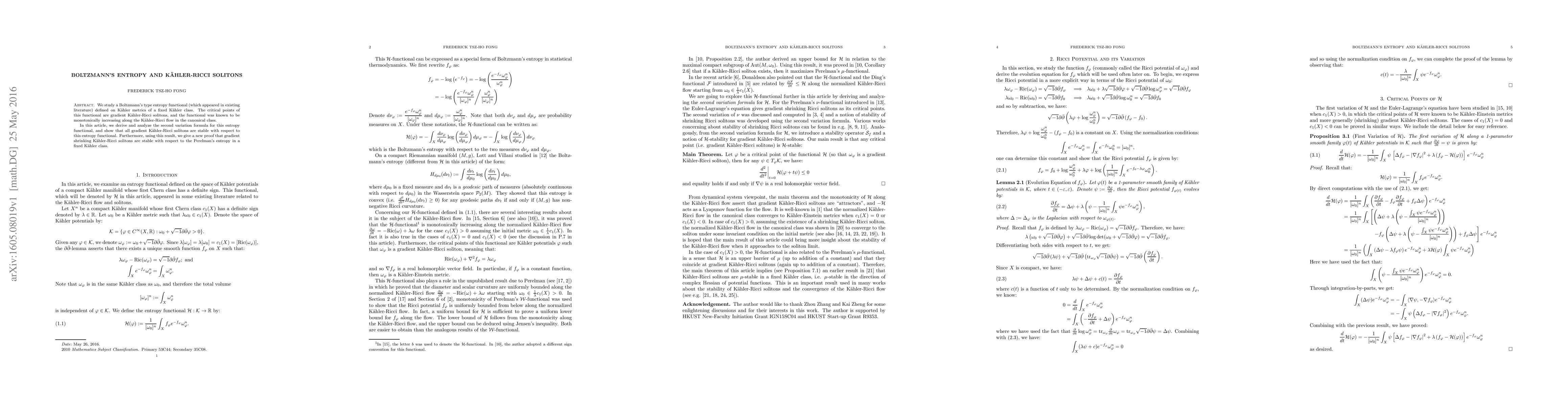 This paper derives and analyzes the second variation formula for a Boltzmann entropy functional defined on Kähler metrics, proving stability of gradient Kähler-Ricci solitons. Additionally, it provides a new proof for the stability of gradient shrinking Kähler-Ricci solitons regarding Perelman's entropy in a fixed Kähler class.