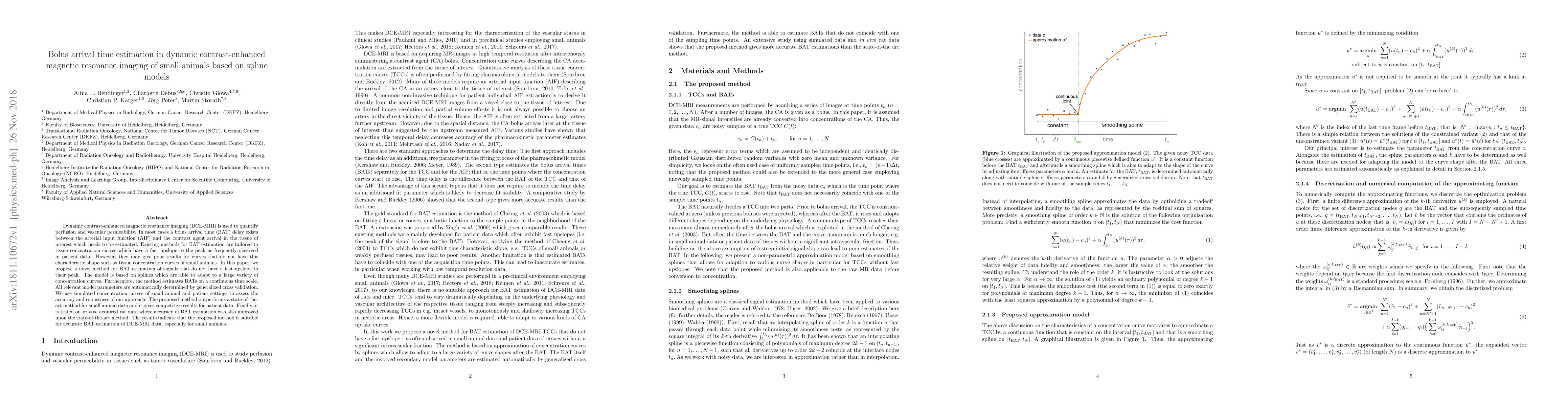 Researchers developed a new method to estimate bolus arrival time in dynamic contrast-enhanced MRI of small animals using spline models, outperforming existing methods with high accuracy.