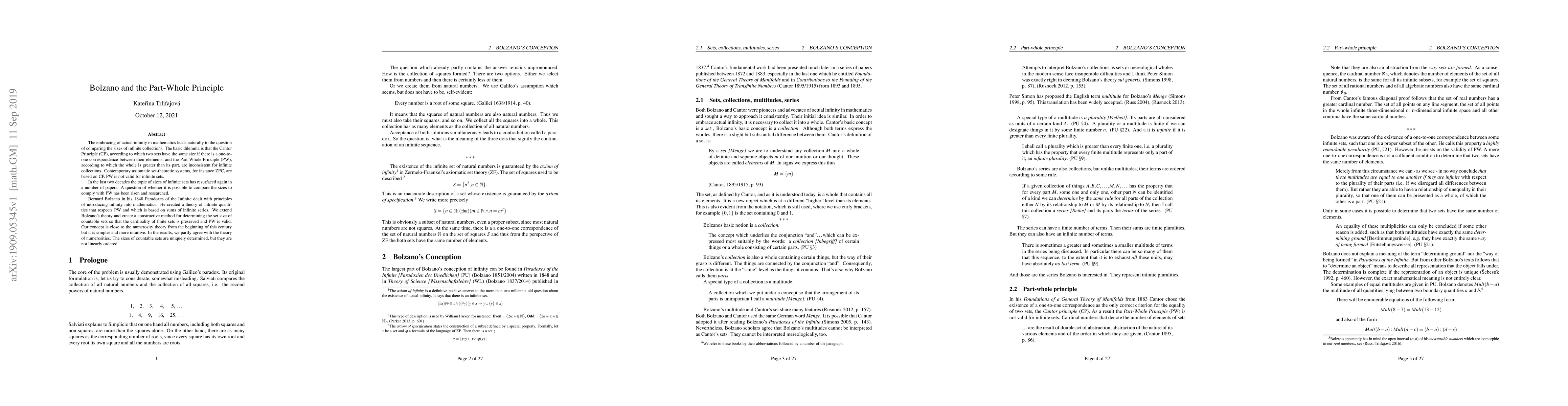 The embracing of actual infinity in mathematics leads naturally to the question of comparing the sizes of infinite collections. The basic dilemma is that the Cantor Principle (CP), according to which two sets have the same size if there is a one-to-one correspondence between their elements, and the Part-Whole Principle (PW), according to which the whole is greater than its part, are inconsistent for infinite collections. Contemporary axiomatic set-theoretic systems, for instance, ZFC, are based on CP. PW is not valid for infinite sets. In the last two decades, the topic of sizes of infinite sets has resurfaced again in a number of papers. A question of whether it is possible to compare the sizes to comply with PW has been risen and researched. Bernard Bolzano in his 1848 Paradoxes of the Infinite dealt with principles of introducing infinity into mathematics. He created a theory of infinite quantities that respects PW and which is based on sums of infinite series. We extend Bolzano's theory and create a constructive method for determining the set size of countable sets so that the cardinality of finite sets is preserved and PW is valid. Our concept is close to the numerosity theory from the beginning of this century but it is simpler and more intuitive. In the results, we partly agree with the theory of numerosities. The sizes of countable sets are uniquely determined, but they are not linearly ordered.