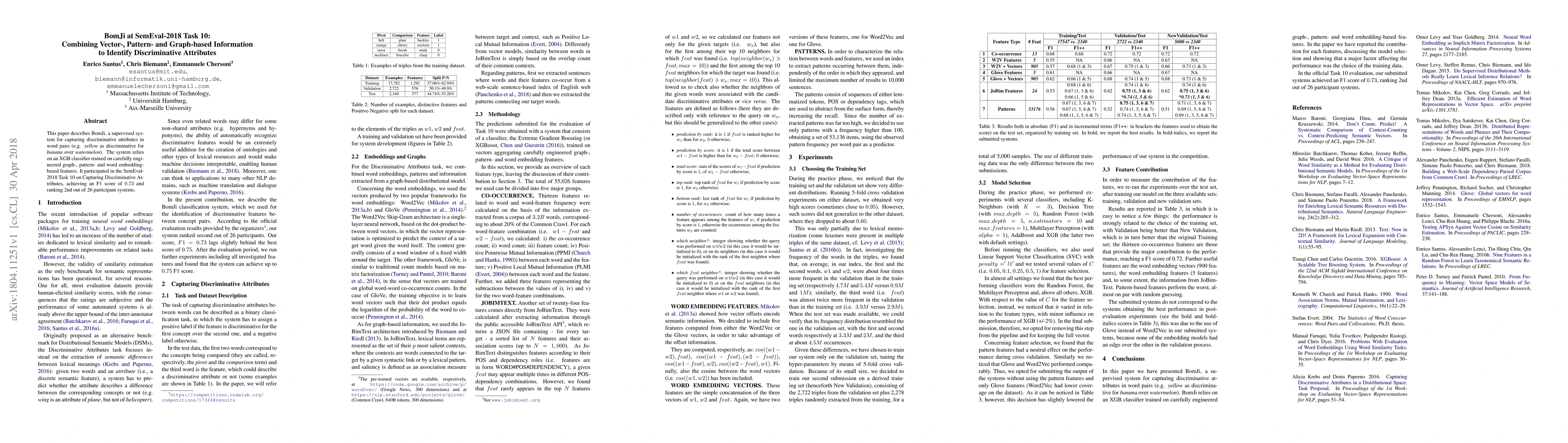 This paper describes BomJi, a supervised system for capturing discriminative attributes in word pairs (e.g. yellow as discriminative for banana over watermelon). The system relies on an XGB classifier trained on carefully engineered graph-, pattern- and word embedding based features. It participated in the SemEval- 2018 Task 10 on Capturing Discriminative Attributes, achieving an F1 score of 0:73 and ranking 2nd out of 26 participant systems.
