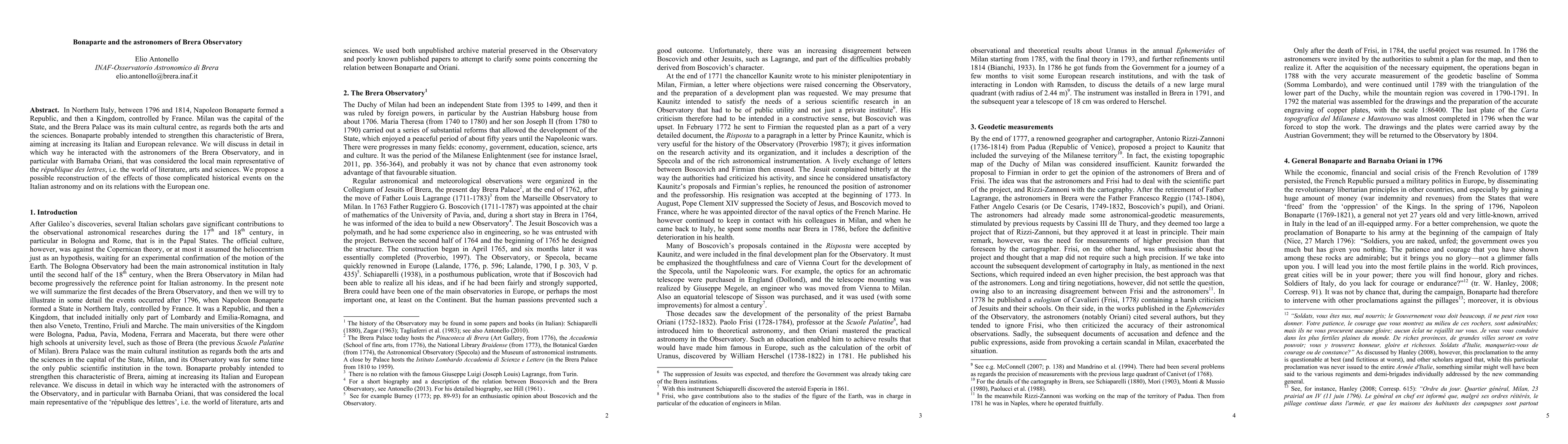 In Northern Italy, between 1796 and 1814, Napoleon Bonaparte formed a Republic, and then a Kingdom, controlled by France. Milan was the capital of the State, and the Brera Palace was the main cultural centre, as regards both the arts and the sciences. Bonaparte probably intended to strengthen this characteristic of Brera, aiming at increasing its Italian and European relevance. We will discuss in detail in which way he interacted with the astronomers of Brera Observatory, and in particular with Barnaba Oriani, that was considered the local main representative of the 'republique des lettres', that is, the world of literature, arts and sciences. We propose a possible reconstruction of the effects of those complicated historical events on the Italian astronomy and on its relations with the European one.