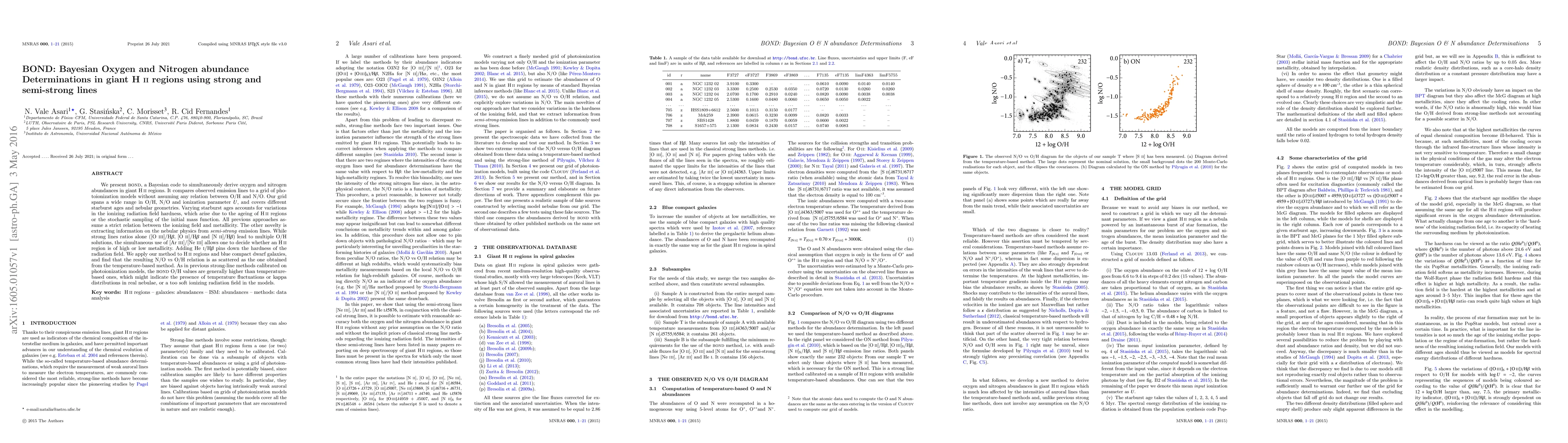 We present BOND, a Bayesian code to simultaneously derive oxygen and nitrogen abundances in giant H II regions. It compares observed emission lines to a grid of photoionization models without assuming any relation between O/H and N/O. Our grid spans a wide range in O/H, N/O and ionization parameter U, and covers different starburst ages and nebular geometries. Varying starburst ages accounts for variations in the ionizing radiation field hardness, which arise due to the ageing of H II regions or the stochastic sampling of the initial mass function. All previous approaches assume a strict relation between the ionizing field and metallicity. The other novelty is extracting information on the nebular physics from semi-strong emission lines. While strong lines ratios alone ([O III]/Hbeta, [O II]/Hbeta and [N II]/Hbeta) lead to multiple O/H solutions, the simultaneous use of [Ar III]/[Ne III] allows one to decide whether an H II region is of high or low metallicity. Adding He I/Hbeta pins down the hardness of the radiation field. We apply our method to H II regions and blue compact dwarf galaxies, and find that the resulting N/O vs O/H relation is as scattered as the one obtained from the temperature-based method. As in previous strong-line methods calibrated on photoionization models, the BOND O/H values are generally higher than temperature-based ones, which might indicate the presence of temperature fluctuations or kappa distributions in real nebulae, or a too soft ionizing radiation field in the models.