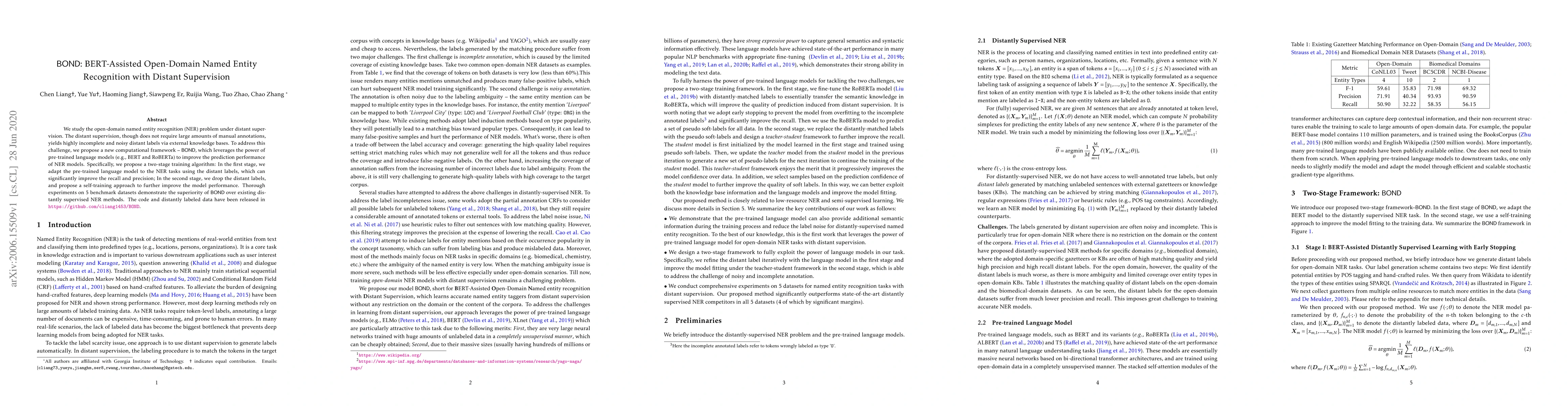 BOND leverages BERT and RoBERTa for BERT-Assisted Open-Domain Named Entity Recognition using distant supervision, addressing the noise in distant labels through a two-stage training algorithm that improves recall and precision, and achieves superior performance over existing methods.