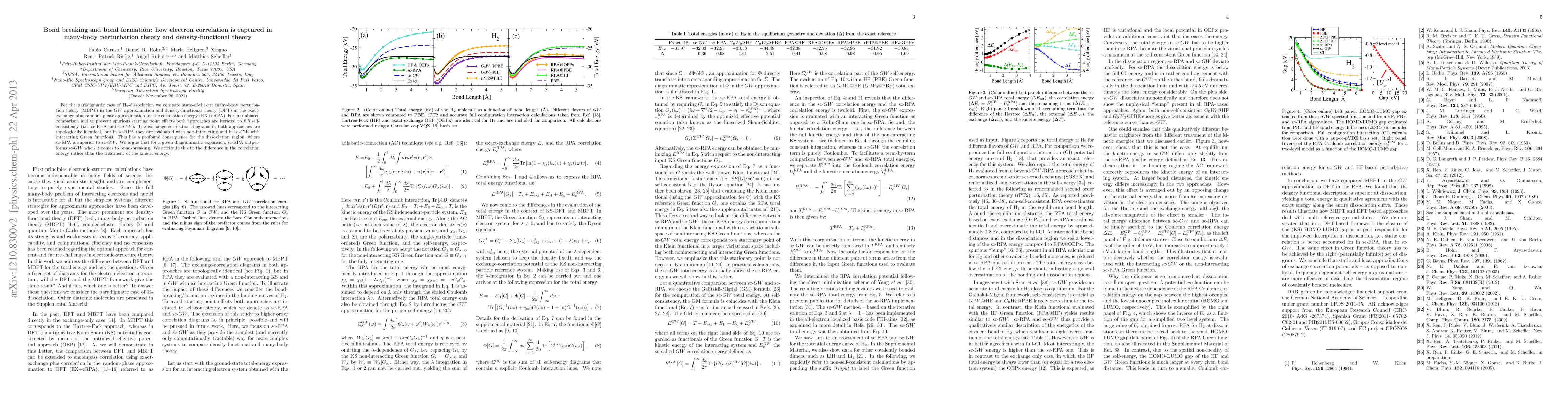 The paper demonstrates an in-depth comparison of self-consistent sc-RPA and sc-GW methods for H2 dissociation, revealing that sc-RPA performs better due to its treatment of correlation energy.
