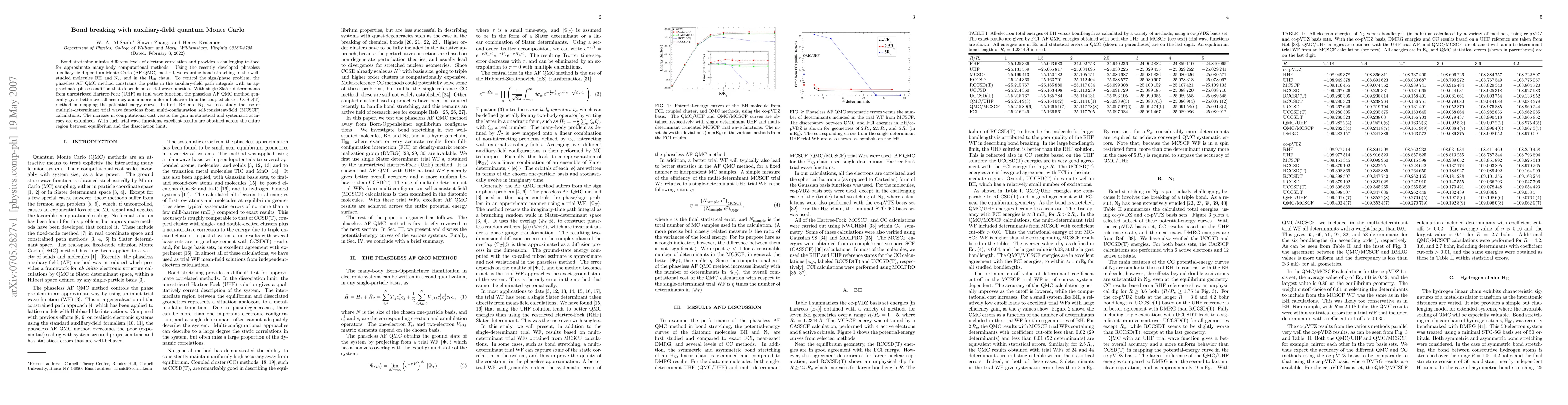 This paper explores bond stretching in BH, N$_2$, and H$_{50}$ using a phaseless auxiliary-field quantum Monte Carlo (AF QMC) method, comparing it to coupled cluster CCSD(T) and MCSCF calculations. The phaseless AF QMC method, using single Slater determinants from UHF, shows better accuracy and uniformity, while MCSCF trial wave functions yield excellent results at higher computational cost.