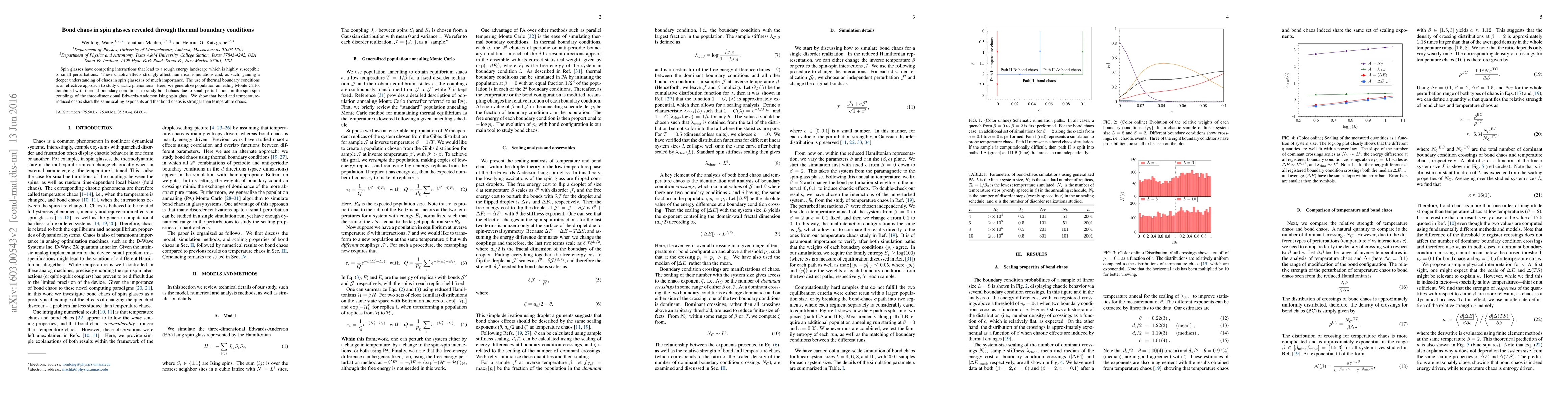 This paper investigates chaos in spin glasses using thermal boundary conditions and population annealing Monte Carlo, revealing that bond chaos due to small perturbations in spin-spin couplings is stronger than temperature chaos, sharing the same scaling exponents. Understanding these chaotic effects is crucial for improving numerical simulations of spin glasses.