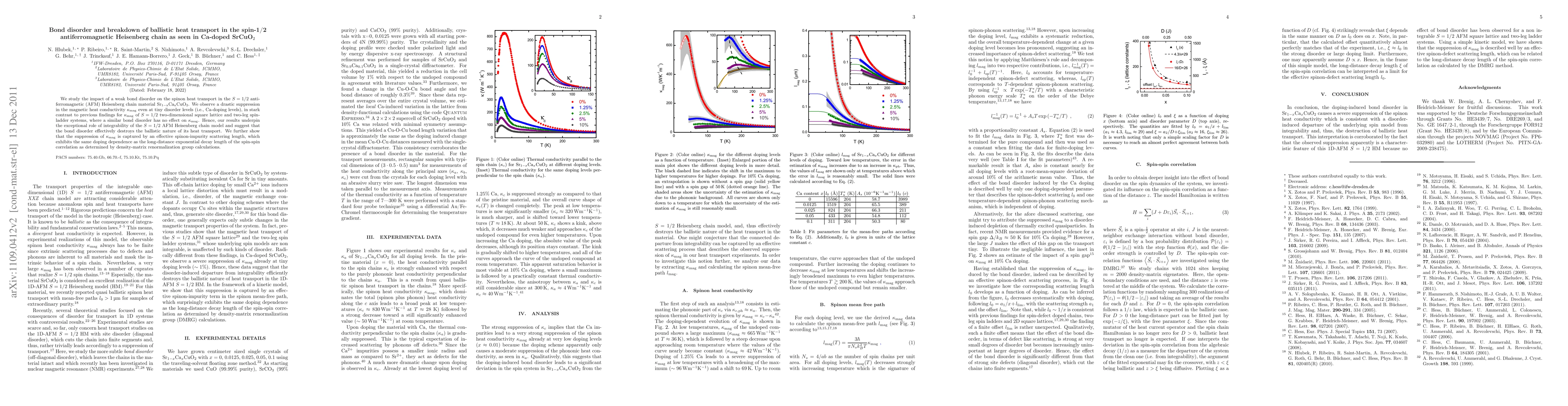 This study investigates the effect of weak bond disorder, introduced via Ca-doping, on the spinon heat transport in the S=1/2 antiferromagnetic Heisenberg chain material Sr_{1-x}Ca_xCuO_2, revealing a significant suppression of magnetic heat conductivity even at low doping levels. The findings suggest that bond disorder disrupts the ballistic heat transport in this one-dimensional system, contrasting with two-dimensional systems where such disorder has negligible effects.