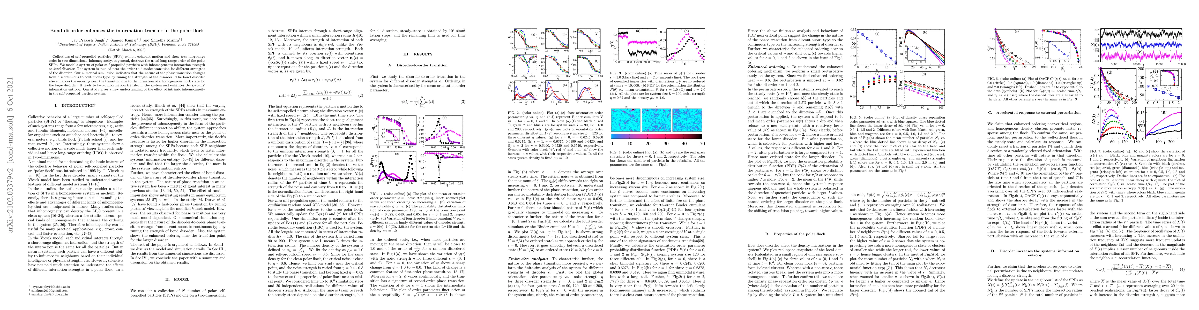 Collection of self-propelled particles (SPPs) exhibit coherent motion and show true long-range order in two-dimensions. Inhomogeneity, in general destroys the usual long-range order of the polar SPPs. We model a system of polar self-propelled particles with inhomogeneous interaction strength or bond disorder. The system is studied near the order-to-disorder transition for different strengths of the disorder. The nature of phase transition changes from discontinuous to continuous type by tuning the strength of the disorder. The bond disorder also enhances the ordering near the transition due to the formation of a homogeneous flock state for the large disorder. It leads to faster information transfer in the system and enhances the system information entropy. Our study gives a new understanding of the effect of intrinsic inhomogeneity in the self-propelled particle system.