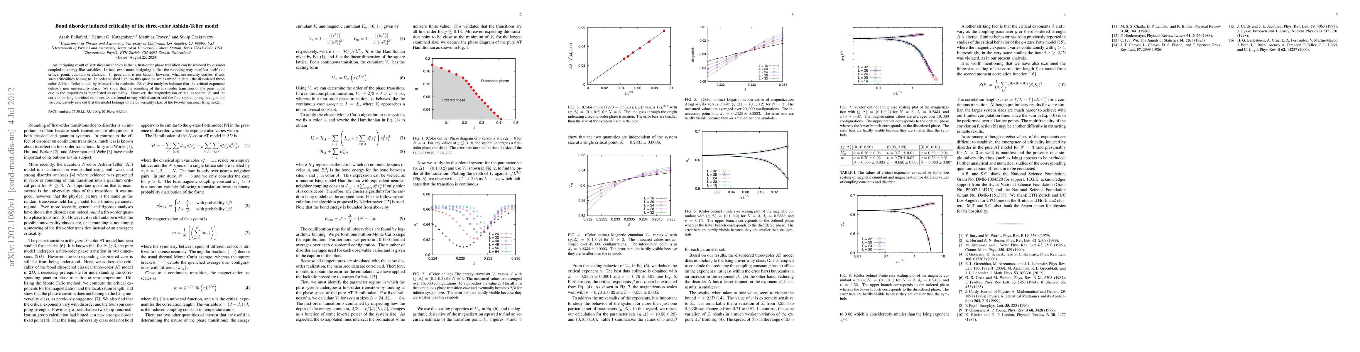 This paper investigates the three-color Ashkin-Teller model under bond disorder, revealing that the first-order phase transition is rounded into a critical point, defining a new universality class distinct from the two-dimensional Ising model. The critical exponents vary with disorder and coupling strength, indicating unique critical behavior.
