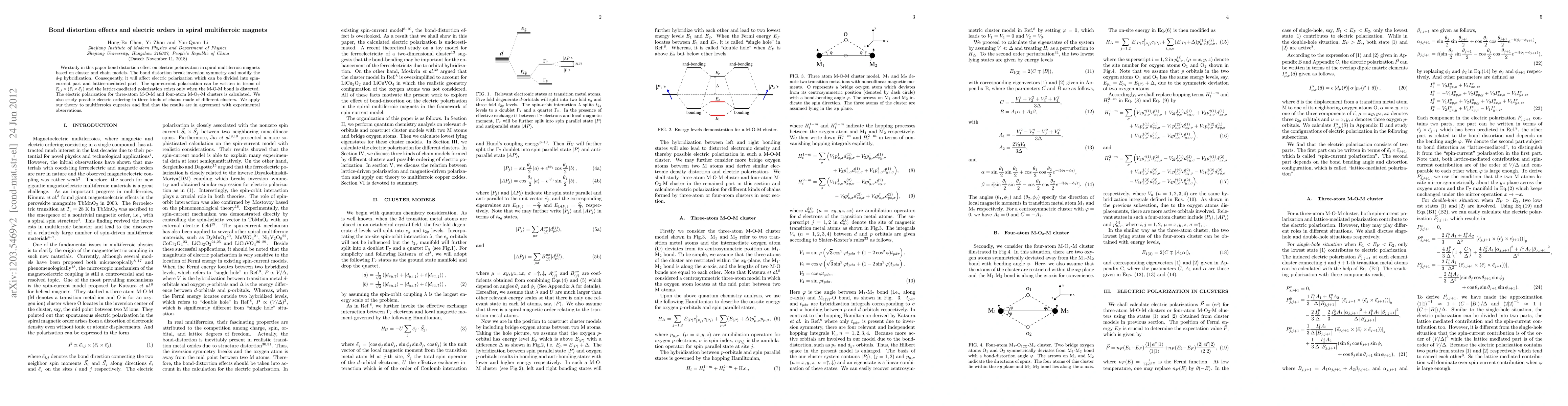 We study in this paper bond distortion effect on electric polarization in spiral multiferroic magnets based on cluster and chain models. The bond distortion break inversion symmetry and modify the $d$-$p$ hybridization. Consequently, it will affect electric polarization which can be divided into spin-current part and lattice-mediated part. The spin-current polarization can be written in terms of $\vec{e}_{i,j}\times(\vec{e}_{i}\times\vec{e}_{j}) $ and the lattice-mediated polarization exists only when the M-O-M bond is distorted. The electric polarization for three-atom M-O-M and four-atom M-O$_{2}$-M clusters is calculated. We also study possible electric ordering in three kinds of chains made of different clusters. We apply our theory to multiferroics cuprates and find that the results are in agreement with experimental observations.
