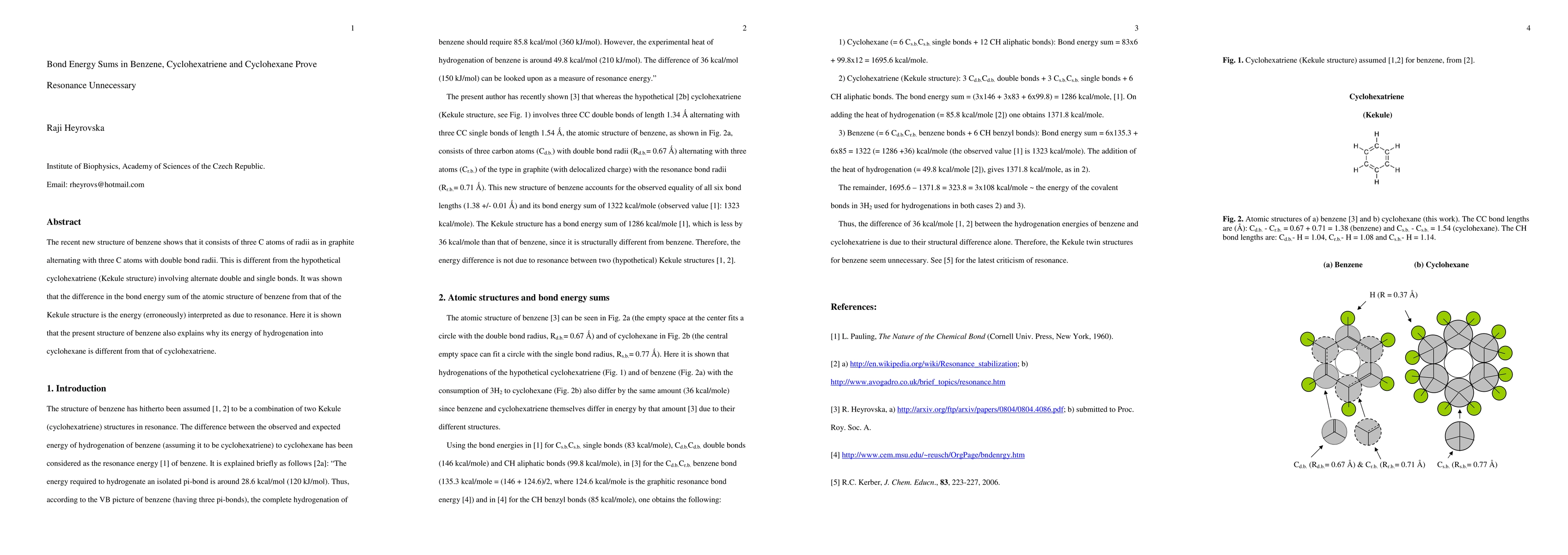 This paper demonstrates that the new structure of benzene, featuring alternating single and double carbon bonds, explains bond energy sums without invoking resonance, and accurately predicts the energy differences in hydrogenation to cyclohexane compared to cyclohexatriene.