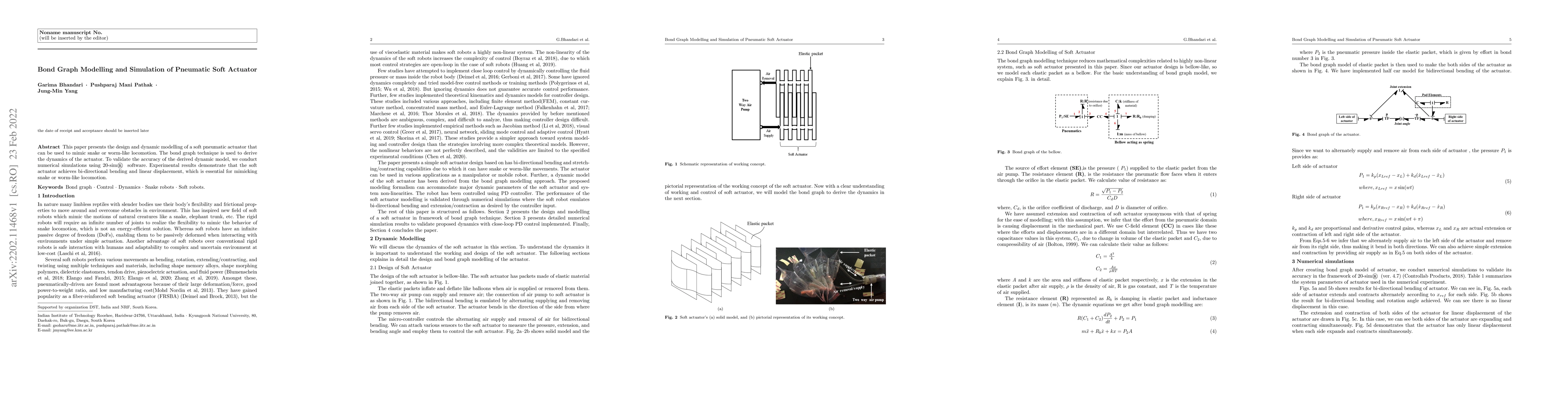 This paper uses bond graph modelling to dynamically simulate a pneumatic soft actuator designed for snake-like locomotion, validated through numerical simulations and experiments showing bi-directional bending and linear displacement.