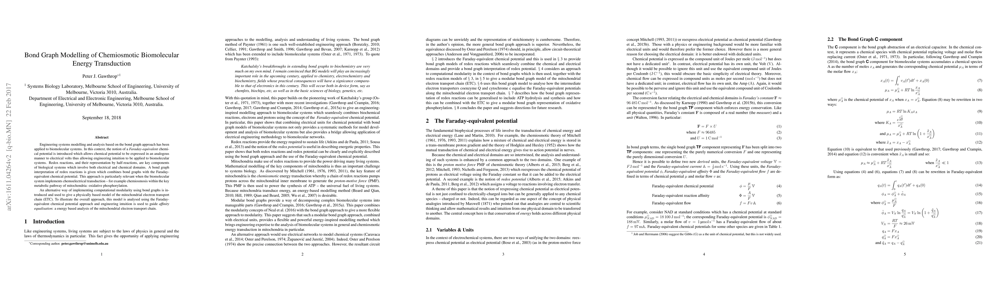 Engineering systems modelling and analysis based on the bond graph approach has been applied to biomolecular systems. In this context, the notion of a Faraday-equivalent chemical potential is introduced which allows chemical potential to be expressed in an analogous manner to electrical volts thus allowing engineering intuition to be applied to biomolecular systems. Redox reactions, and their representation by half-reactions, are key components of biological systems which involve both electrical and chemical domains. A bond graph interpretation of redox reactions is given which combines bond graphs with the Faraday- equivalent chemical potential. This approach is particularly relevant when the biomolecular system implements chemoelectrical transduction - for example chemiosmosis within the key metabolic pathway of mitochondria: oxidative phosphorylation. An alternative way of implementing computational modularity using bond graphs is introduced and used to give a physically based model of the mitochondrial electron transport chain. To illustrate the overall approach, this model is analysed using the Faraday-equivalent chemical potential approach and engineering intuition is used to guide affinity equalisation: a energy based analysis of the mitochondrial electron transport chain.