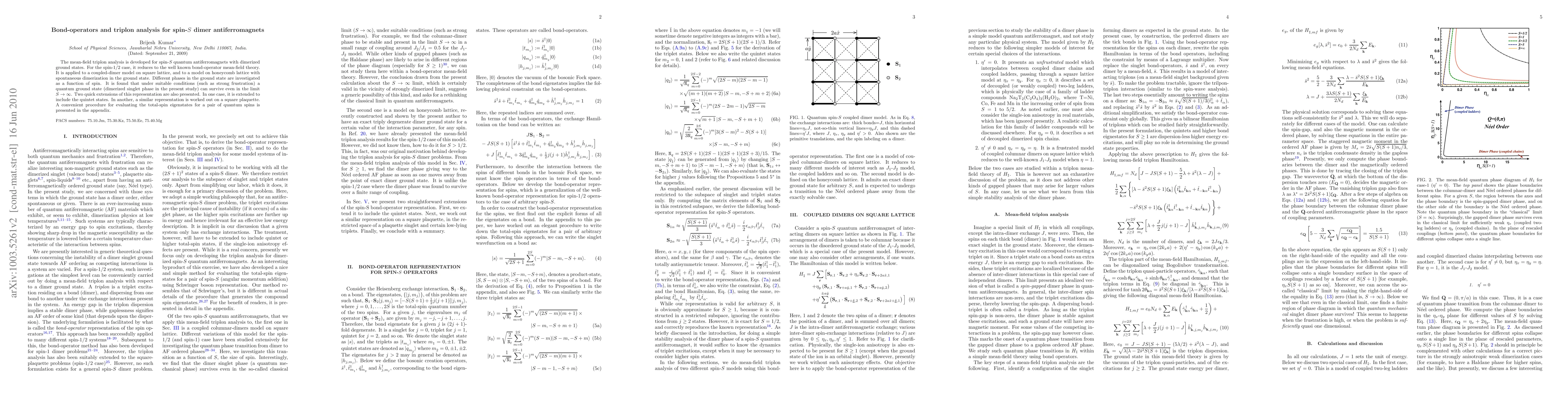 The paper develops a mean-field triplon analysis for spin-S quantum antiferromagnets with dimerized ground states, applying it to coupled-dimer models on square and honeycomb lattices. It discovers that under strong frustration, a quantum ground state can endure even as spin S approaches infinity. The method is extended to include quintet states and applied to square plaquettes, with a procedure for total-spin eigenstates provided in the appendix.