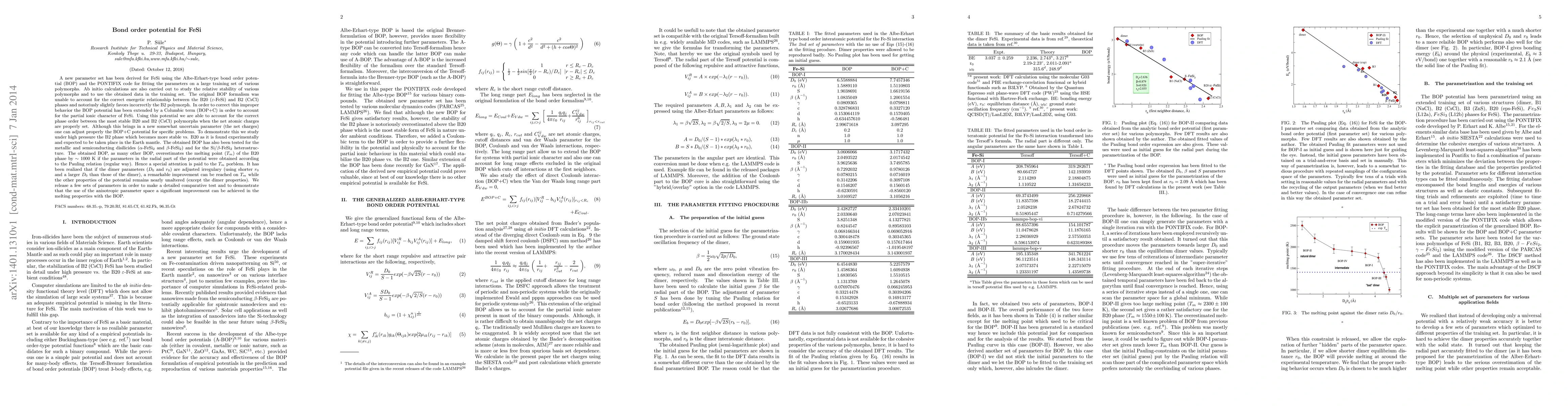 A new parameter set has been derived for FeSi using the Albe-Erhart-type bond order potential (BOP) and the PONTIFIX code for fitting the parameters on a large training set of various polymorphs. Ab initio calculations are also carried out to study the relative stability of various polymorphs and to use the obtained data in the training set. The original BOP formalism was unable to account for the correct energetic relationship between the B20 ($\epsilon$-FeSi) and B2 (CsCl) phases and notoriusly slightly favors incorrectly the B2 polymorph. In order to correct this improper behavior the BOP potential has been extended by a Columbic term (BOP+C) in order to account for the partial ionic character of FeSi. Using this potential we are able to account for the correct phase order between the most stable B20 and B2 (CsCl) polymorphs when the net atomic charges are properly set. Although this brings in a new somewhat uncertain parameter (the net charges) one can adjust properly the BOP+C potential for specific problems. To demonstrate this we study under high pressure the B2 phase which becomes more stable vs. B20 as it is found experimentally and expected to be taken place in the Earth mantle. The obtained BOP has also been tested for the metallic and semiconducting disilicides ($\alpha$-FeSi$_2$ and $\beta$-FeSi$_2$) and for the Si/$\beta$-FeSi$_2$ heterostructure. The obtained BOP, as many other BOP, overestimates the melting point ($T_m$) of the B20 phase by $\sim 1000$ K if the parameters in the radial part of the potential were obtained according to the Pauling relation (regular way).