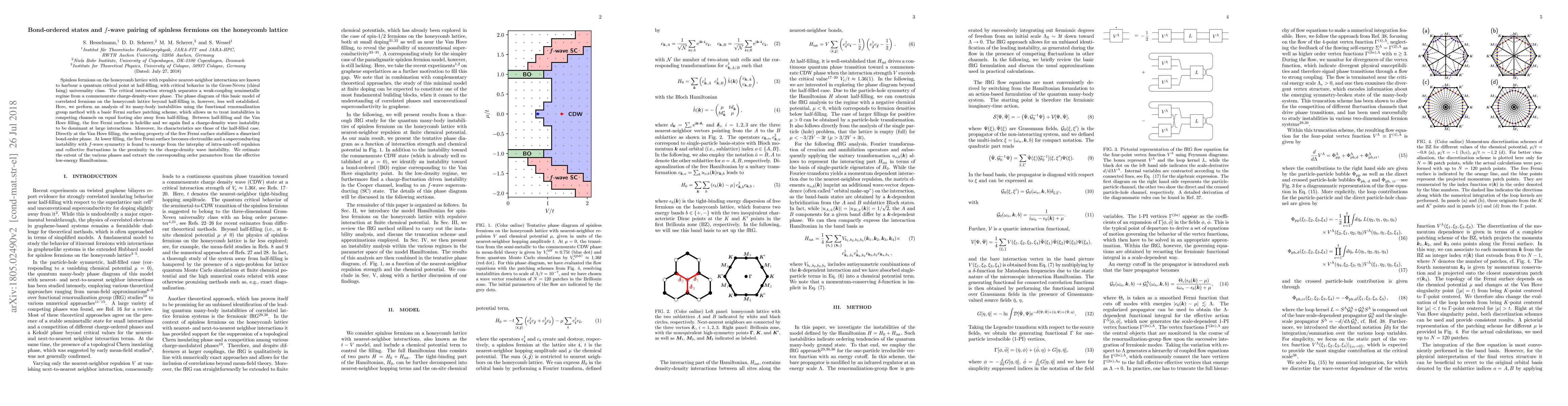 Spinless fermions on the honeycomb lattice with repulsive nearest-neighbor interactions are known to harbour a quantum critical point at half-filling, with critical behaviour in the Gross-Neveu (chiral Ising) universality class. The critical interaction strength separates a weak-coupling semimetallic regime from a commensurate charge-density-wave phase. The phase diagram of this basic model of correlated fermions on the honeycomb lattice beyond half-filling is, however, less well established. Here, we perform an analysis of its many-body instabilities using the functional renormalization group method with a basic Fermi surface patching scheme, which allows us to treat instabilities in competing channels on equal footing also away from half-filling. Between half-filling and the van-Hove filling, the free Fermi surface is hole-like and we again find a charge-density wave instability to be dominant at large interactions. Moreover, its characteristics are those of the half-filled case. Directly at the van-Hove filling the nesting property of the free Fermi surface stabilizes a dimerized bond-order phase. At lower filling the free Fermi surface becomes electron-like and a superconducting instability with $f$-wave symmetry is found to emerge from the interplay of intra-unitcell repulsion and collective fluctuations in the proximity to the charge-density wave instability. We estimate the extent of the various phases and extract the corresponding order parameters from the effective low-energy Hamiltonians.