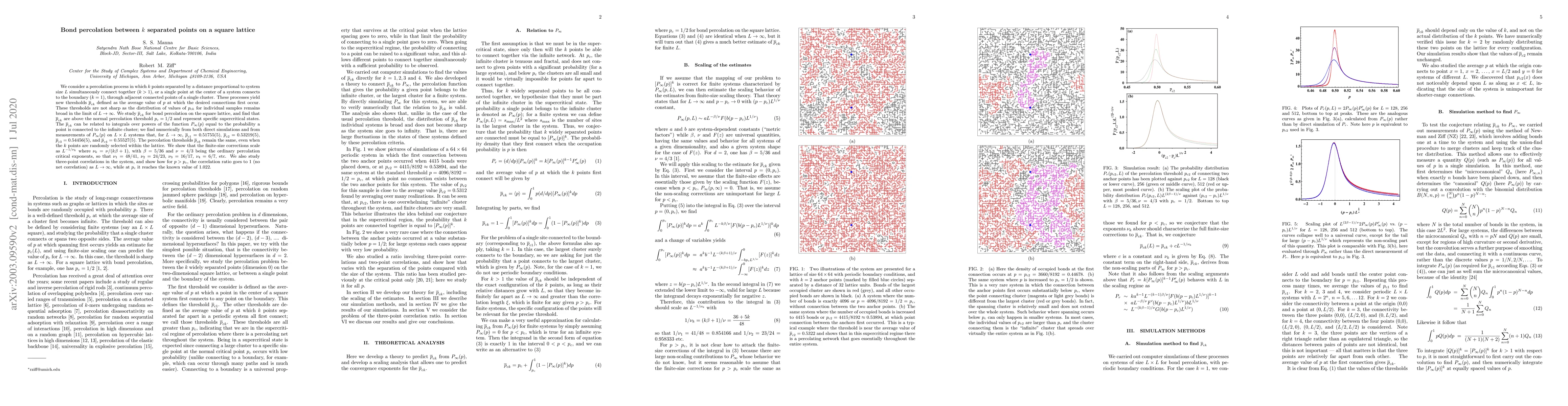 We consider a percolation process in which $k$ points separated by a distance proportional to system size $L$ simultaneously connect together ($k>1$), or a single point at the center of a system connects to the boundary ($k=1$), through adjacent connected points of a single cluster. These processes yield new thresholds $\overline p_{ck}$ defined as the average value of $p$ at which the desired connections first occur. These thresholds are not sharp as the distribution of values of $p_{ck}$ for individual samples remains broad in the limit of $L \to \infty$. We study $\overline p_{ck}$ for bond percolation on the square lattice, and find that $\overline p_{ck}$ are above the normal percolation threshold $p_c = 1/2$ and represent specific supercritical states. The $\overline p_{ck}$ can be related to integrals over powers of the function $P_\infty(p)$ equal to the probability a point is connected to the infinite cluster; we find numerically from both direct simulations and from measurements of $P_\infty(p)$ on $L\times L$ systems that, for $L \to \infty$, $\overline p_{c1} = 0.51755(5)$, $\overline p_{c2} = 0.53219(5)$, $\overline p_{c3} = 0.54456(5)$, and $\overline p_{c4} = 0.55527(5).$ The percolation thresholds $\overline p_{ck}$ remain the same, even when the $k$ points are randomly selected within the lattice. We show that the finite-size corrections scale as $L^{-1/\nu_k}$ where $\nu_k = \nu/(k \beta +1)$, with $\beta=5/36$ and $\nu=4/3$ being the ordinary percolation critical exponents, so that $\nu_1= 48/41$, $\nu_2 = 24/23$, $\nu_3 = 16/17$, $\nu_4 = 6/7$, etc. We also study three-point correlations in the system, and show how for $p>p_c$, the correlation ratio goes to 1 (no net correlation) as $L \to \infty$, while at $p_c$ it reaches the known value of 1.022.