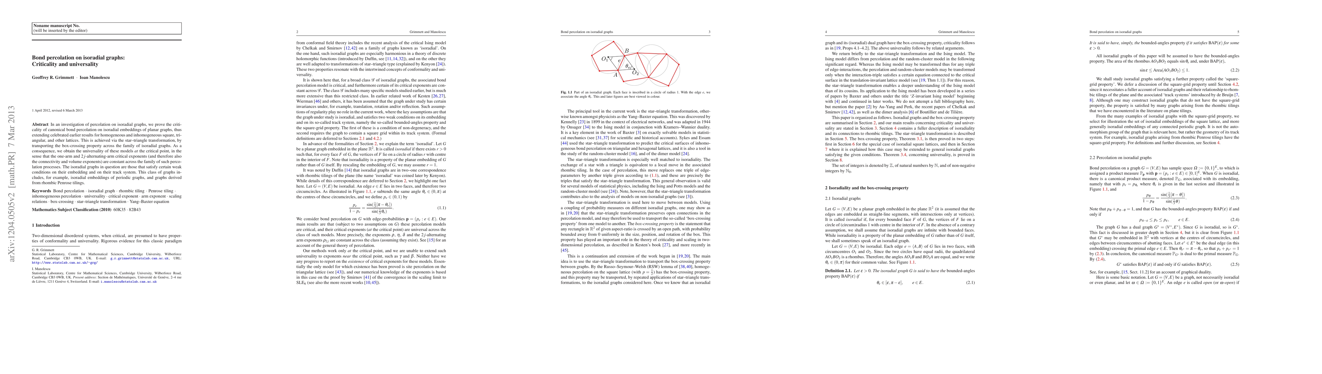 This research extends the criticality and universality of bond percolation to isoradial graphs via the star-triangle transformation, establishing constant critical exponents across these embeddings and including examples like periodic graphs and rhombic Penrose tilings.