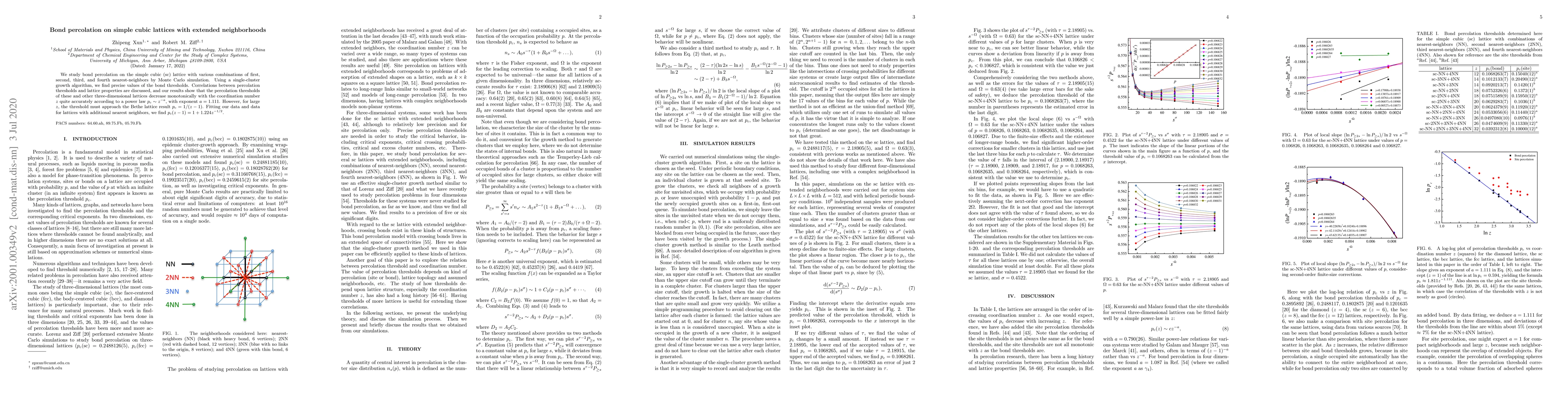This paper investigates bond percolation on simple cubic lattices with extended neighborhoods using Monte Carlo simulations, revealing precise bond thresholds. It finds that percolation thresholds decrease with coordination number $z$ according to a power law $p_{c} \sim z^{-1.111}$, approaching the Bethe lattice result for large $z$.