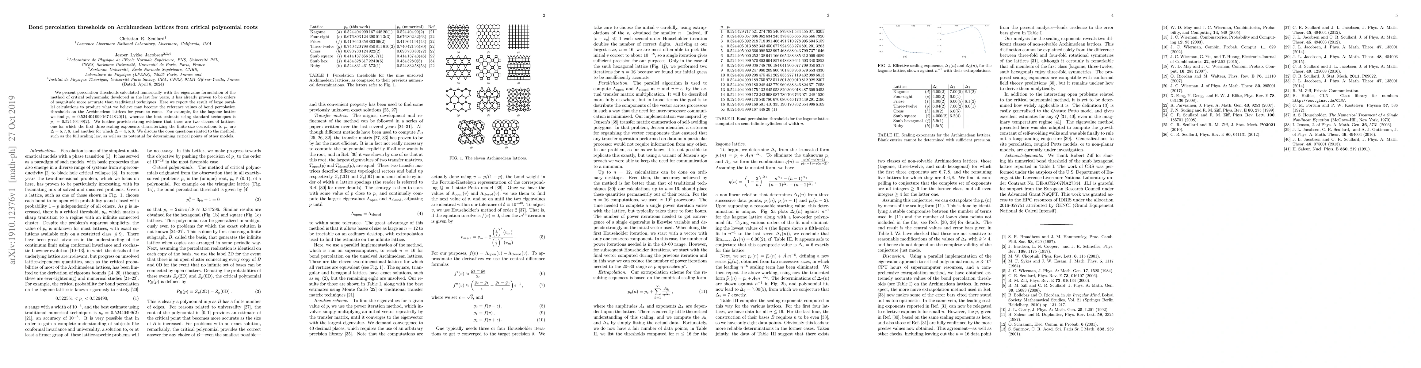 We present percolation thresholds calculated numerically with the eigenvalue formulation of the method of critical polynomials; developed in the last few years, it has already proven to be orders of magnitude more accurate than traditional techniques. Here we report the result of large parallel calculations to produce what we believe may become the reference values of bond percolation thresholds on the Archimedean lattices for years to come. For example, for the kagome lattice we find $p_{\rm c}=0.524\,404\,999\,167\,448\,20 (1)$, whereas the best estimate using standard techniques is $p_{\rm c}=0.524\,404\,99(2)$. We further provide strong evidence that there are two classes of lattices: one for which the first three scaling exponents characterizing the finite-size corrections to $p_{\rm c}$ are $\Delta=6,7,8$, and another for which $\Delta=4,6,8$. We discuss the open questions related to the method, such as the full scaling law, as well as its potential for determining critical points of other models.