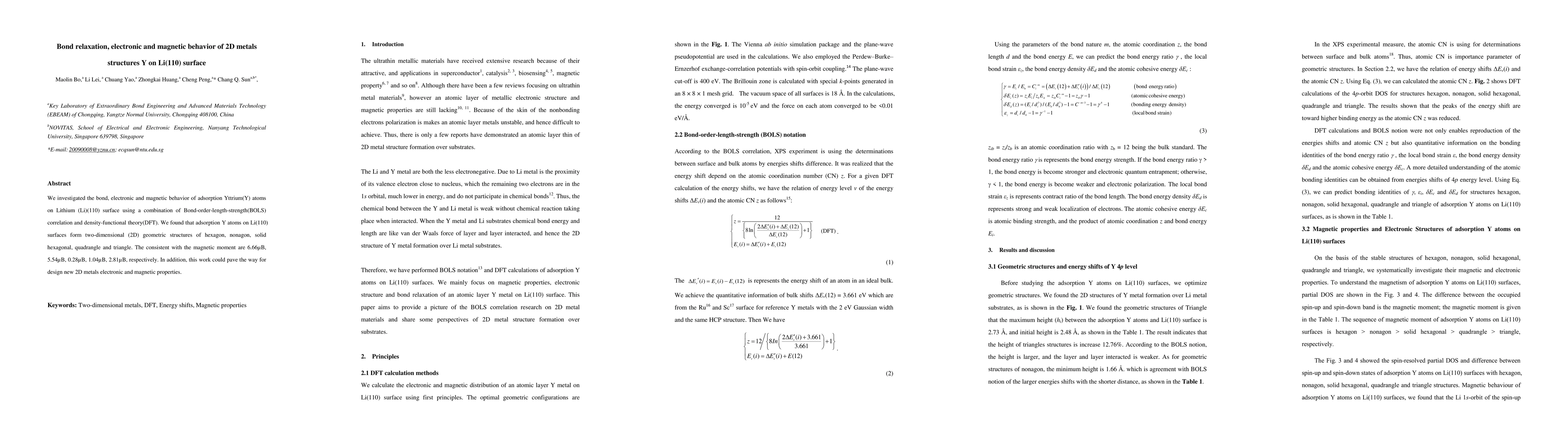 We investigated the bond, electronic and magnetic behavior of adsorption Yttrium atoms on Lithium (110) surface using a combination of Bond-order-length-strength(BOLS) correlation and density-functional theory(DFT). We found that adsorption Y atoms on Li(110) surfaces form two-dimensional (2D) geometric structures of hexagon, nonagon, solid hexagonal, quadrangle and triangle. The consistent with the magnetic moment are 6.66{\mu}B, 5.54{\mu}B, 0.28{\mu}B, 1.04{\mu}B, 2.81{\mu}B, respectively. In addition, this work could pave the way for design new 2D metals electronic and magnetic properties.