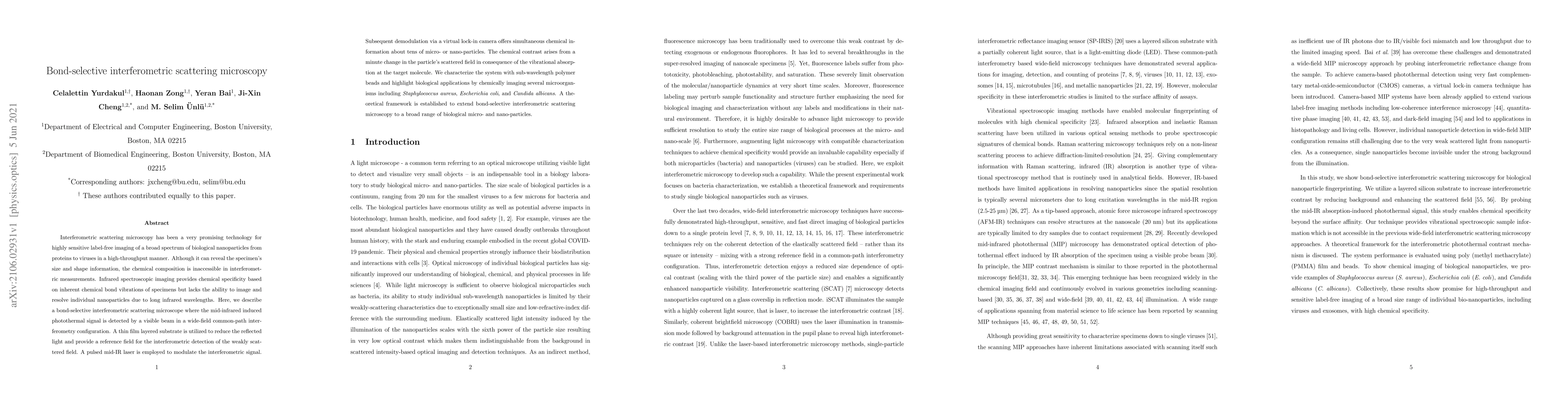 This paper introduces a bond-selective interferometric scattering microscope that combines interferometric scattering microscopy with mid-infrared spectroscopy to provide both high-throughput imaging and chemical composition analysis of biological nanoparticles. The method uses a pulsed mid-IR laser and a visible beam interferometry setup to detect chemical specificity from molecular vibrations while resolving individual nanoparticles.
