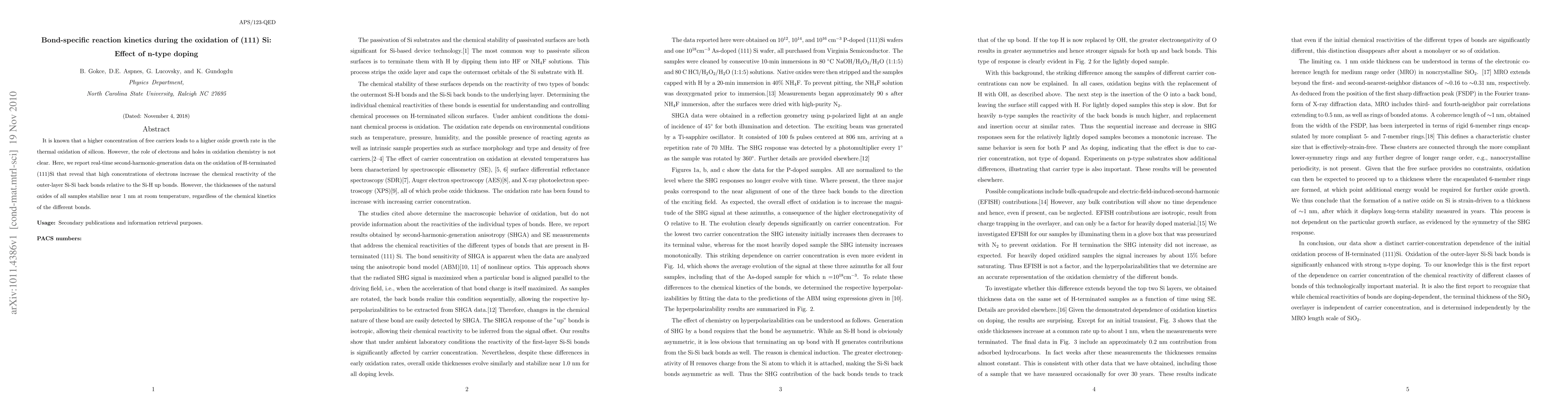 It is known that a higher concentration of free carriers leads to a higher oxide growth rate in the thermal oxidation of silicon. However, the role of electrons and holes in oxidation chemistry is not clear. Here, we report real-time second-harmonic-generation data on the oxidation of H-terminated (111)Si that reveal that high concentrations of electrons increase the chemical reactivity of the outer-layer Si-Si back bonds relative to the Si-H up bonds. However, the thicknesses of the natural oxides of all samples stabilize near 1 nm at room temperature, regardless of the chemical kinetics of the different bonds.