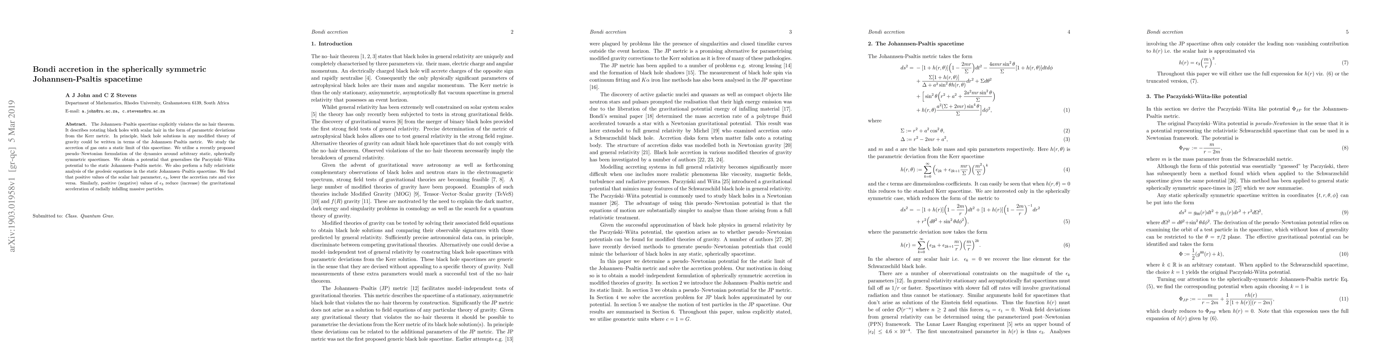 The Johannsen-Psaltis spacetime explicitly violates the no hair theorem. It describes rotating black holes with scalar hair in the form of parametric deviations from the Kerr metric. In principle, black hole solutions in any modified theory of gravity could be written in terms of the Johannsen-Psaltis metric. We study the accretion of gas onto a static limit of this spacetime. We utilise a recently proposed pseudo-Newtonian formulation of the dynamics around arbitrary static, spherically symmetric spacetimes. We obtain a potential that generalises the Paczy\'nski-Wiita potential to the static Johannsen-Psaltis metric. We also perform a fully relativistic analysis of the geodesic equations in the static Johannsen-Psaltis spacetime. We find that positive values of the scalar hair parameter, $\epsilon_{3}$, lower the accretion rate and vice versa. Similarly, positive (negative) values of $\epsilon_{3}$ reduce (increase) the gravitational acceleration of radially infalling massive particles.