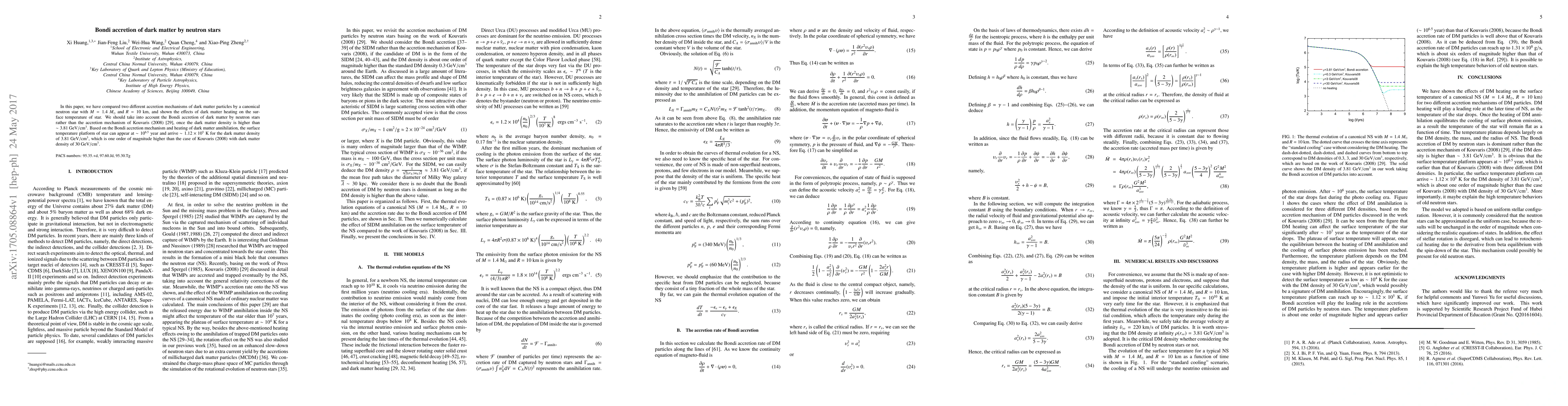 This paper contrasts dark matter accretion mechanisms by neutron stars, finding Bondi accretion more applicable than Kouvaris' model when dark matter density exceeds 3.81 GeV/cm³. The study predicts a surface temperature plateau around 10⁶.⁵ years and 1.12×10⁵ K for a dark matter density of 3.81 GeV/cm³, significantly higher than Kouvaris' 30 GeV/cm³ scenario.