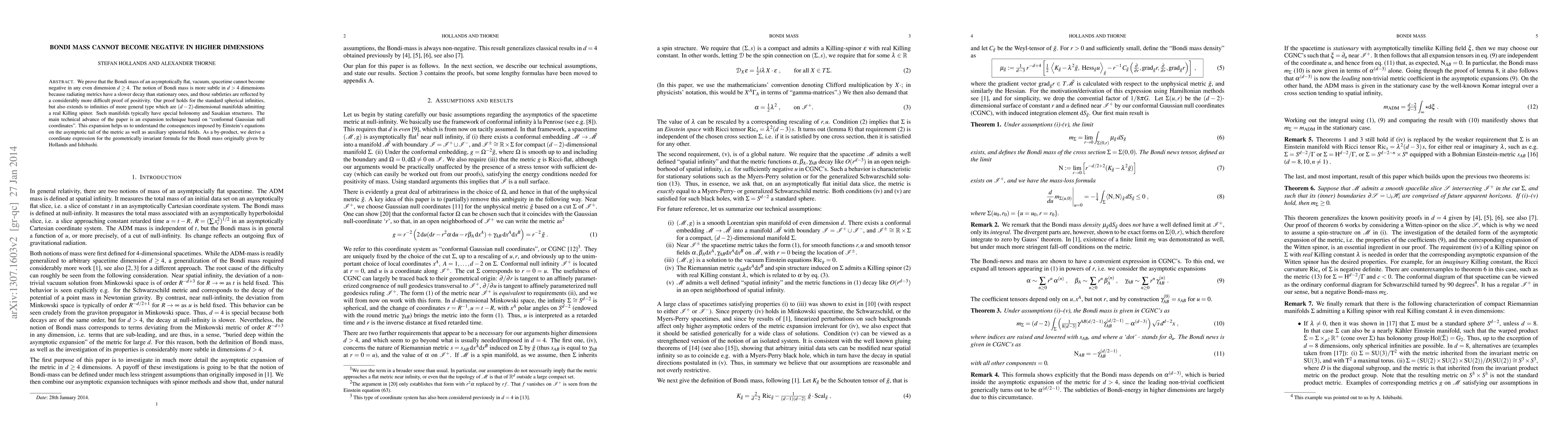 This paper proves that the Bondi mass in asymptotically flat, vacuum spacetimes cannot become negative in dimensions $d \ge 4$, employing a novel expansion technique in conformal Gaussian null coordinates. The proof extends to various types of $(d-2)$-dimensional manifolds with special holonomy and Sasakian structures.