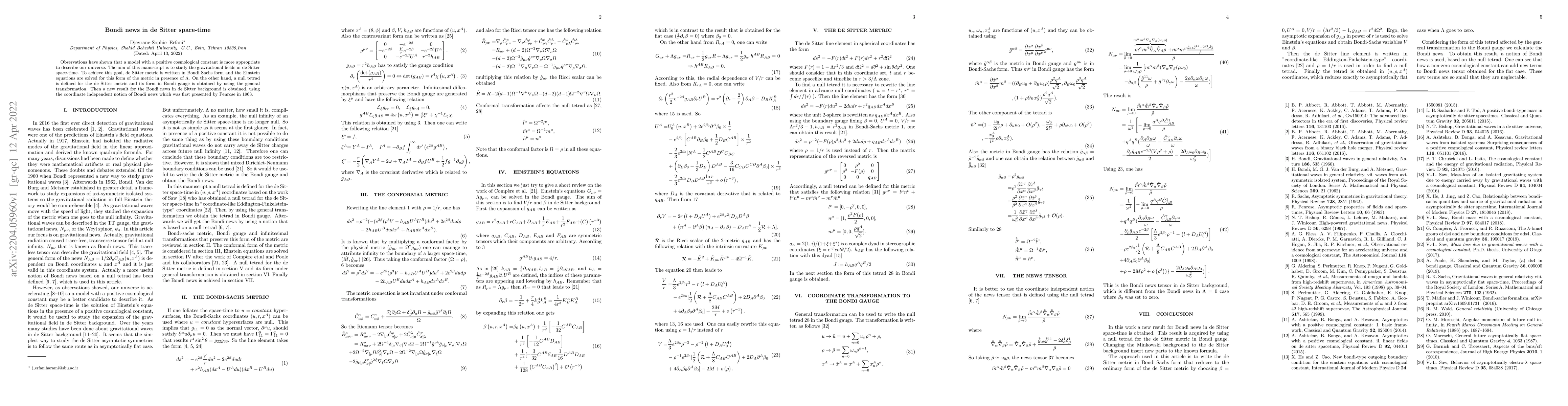 This paper investigates gravitational fields in de Sitter space-time by expressing the de Sitter metric in Bondi-Sachs form and solving the Einstein equations for a positive cosmological constant. It also derives the Bondi news in de Sitter space using a null tetrad and a coordinate-independent notion introduced by Penrose.