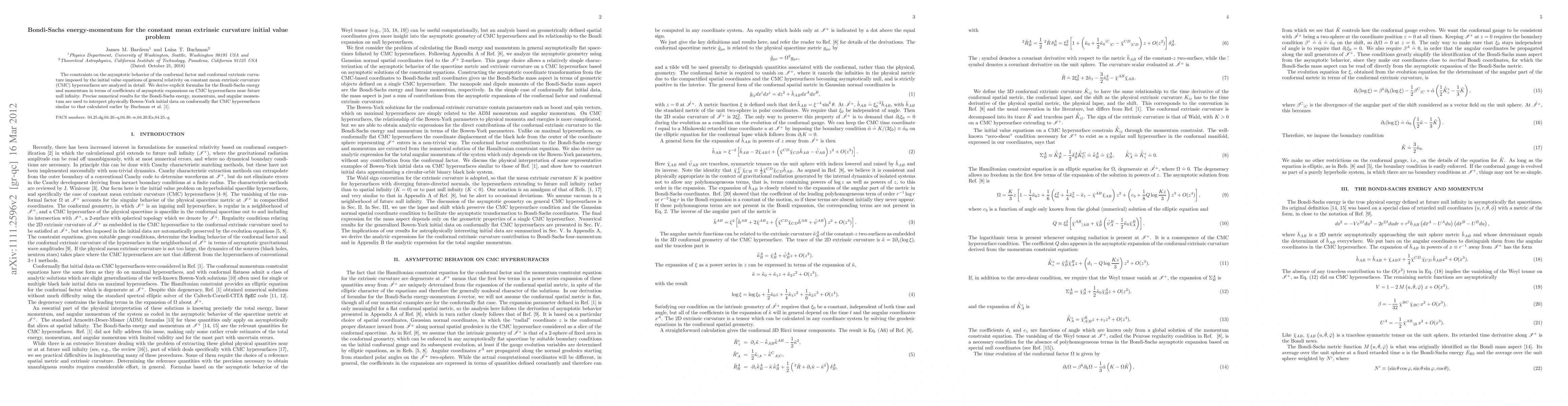 This paper analyzes the constraints on the asymptotic behavior of conformal factors and extrinsic curvature in the initial value problem of general relativity on CMC hypersurfaces. It derives explicit formulas for Bondi-Sachs energy and momentum, using numerical results to interpret Bowen-York solutions on conformally flat CMC hypersurfaces.