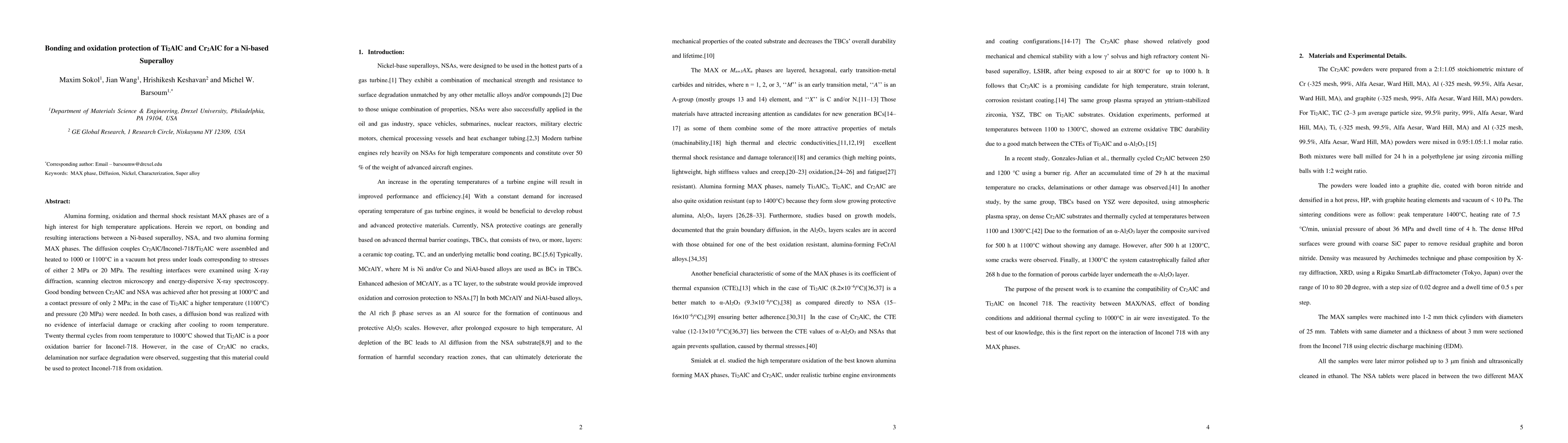 The paper presents a detailed analysis of the bonding and oxidation protection properties of Ti2AlC and Cr2AlC MAX phases with a Ni-based superalloy, Inconel-718, under controlled hot pressing conditions.