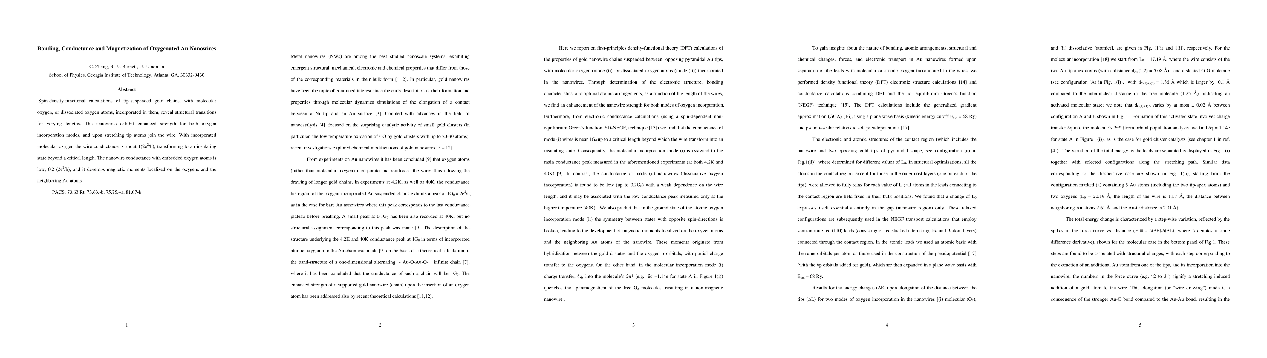 Summary: This study explores the bonding and conductance properties of oxygenated gold nanowires, revealing structural transitions and enhanced strength due to oxygen incorporation. Conductance is high with molecular oxygen and low with dissociated oxygen, while embedded oxygen atoms induce localized magnetic moments.