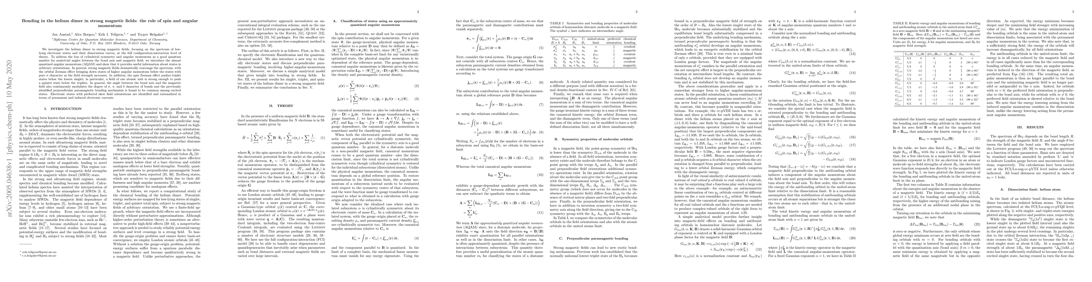 We investigate the helium dimer in strong magnetic fields, focusing on the spectrum of low-lying electronic states and their dissociation curves, at the full configuration-interaction level of theory. To address the loss of cylindrical symmetry and angular momentum as a good quantum number for nontrivial angles between the bond axis and magnetic field, we introduce the almost quantized angular momentum (AQAM) and show that it provides useful information about states in arbitrary orientations. In general, strong magnetic fields dramatically rearrange the spectrum, with the orbital Zeeman effect bringing down states of higher angular momentum below the states with pure $\sigma$ character as the field strength increases. In addition, the spin Zeeman effect pushes triplet states below the lowest singlet; in particular, a field of one atomic unit is strong enough to push a quintet state below the triplets. In general, the angle between the bond axis and the magnetic field also continuously modulates the degree of $\sigma$, $\pi$, and $\delta$ character of bonds and the previously identified perpendicular paramagnetic bonding mechanism is found to be common among excited states. Electronic states with preferred skew field orientations are identified and rationalized in terms of permanent and induced electronic currents.