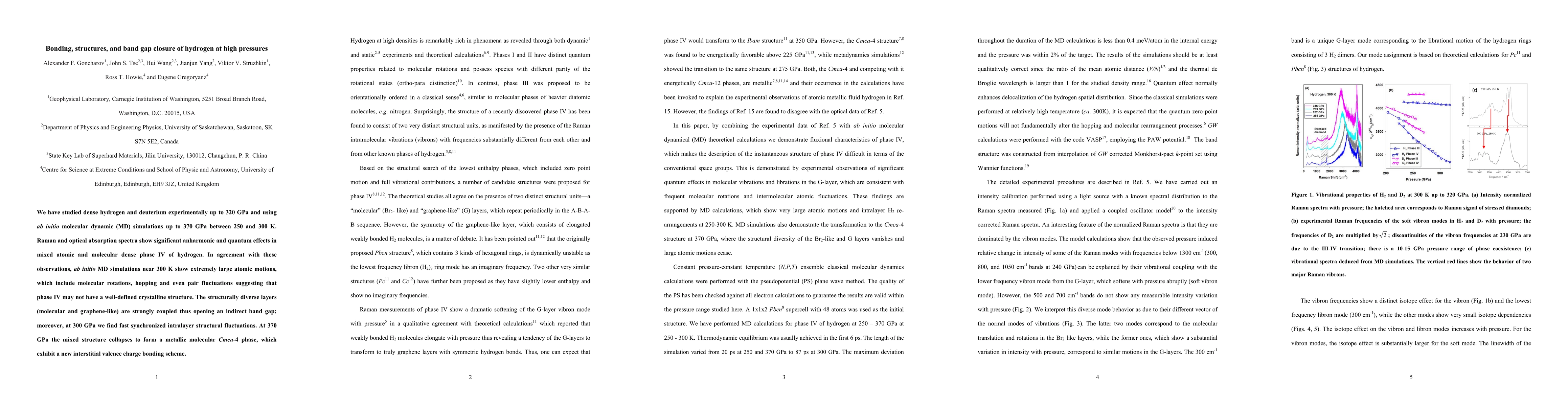 The study experimentally and computationally examines high-pressure dense hydrogen, revealing anharmonic molecular behaviors and large atomic motions up to 370 GPa. At 370 GPa, a metallic Cmca-4 phase emerges with novel charge bonding, signifying a transition from an indistinct crystalline structure to a metallic state.