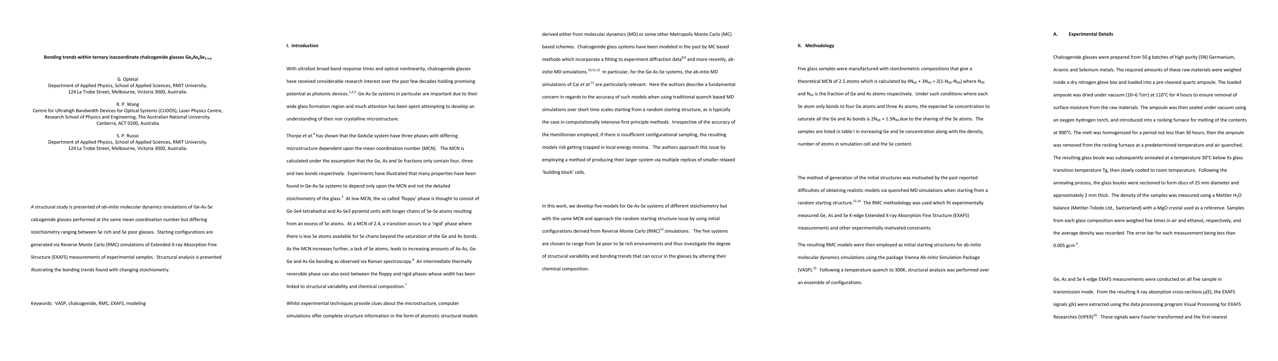 A structural study is presented of ab-initio molecular dynamics simulations of Ge-As-Se calcogenide glasses performed at the same mean coordination number but differing stoichiometry ranging between Se rich and Se poor glasses. Starting configurations are generated via Reverse Monte Carlo (RMC) simulations of Extended X-ray Absorption Fine Structure (EXAFS) measurements of experimental samples. Structural analysis is presented illustrating the bonding trends found with changing stoichiometry.