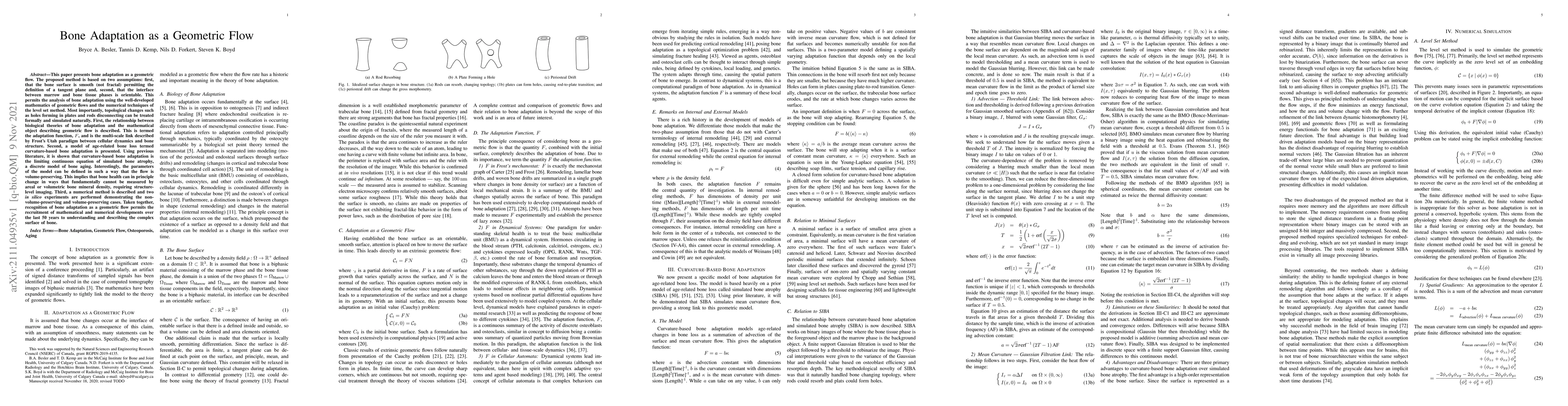 This paper presents bone adaptation as a geometric flow. The proposed method is based on two assumptions: first, that the bone surface is smooth (not fractal) permitting the definition of a tangent plane and, second, that the interface between marrow and bone tissue phases is orientable. This permits the analysis of bone adaptation using the well-developed mathematics of geometric flows and the numerical techniques of the level set method. Most importantly, topological changes such as holes forming in plates and rods disconnecting can be treated formally and simulated naturally. First, the relationship between biological theories of bone adaptation and the mathematical object describing geometric flow is described. This is termed the adaptation function, $F$, and is the multi-scale link described by Frost's Utah paradigm between cellular dynamics and bone structure. Second, a model of age-related bone loss termed curvature-based bone adaptation is presented. Using previous literature, it is shown that curvature-based bone adaptation is the limiting continuous equation of simulated bone atrophy, a discrete model of bone aging. Interestingly, the parameters of the model can be defined in such a way that the flow is volume-preserving. This implies that bone health can in principle change in ways that fundamentally cannot be measured by areal or volumetric bone mineral density, requiring structure-level imaging. Third, a numerical method is described and two in silico experiments are performed demonstrating the non-volume-preserving and volume-preserving cases. Taken together, recognition of bone adaptation as a geometric flow permits the recruitment of mathematical and numerical developments over the last 50 years to understanding and describing the complex surface of bone.
